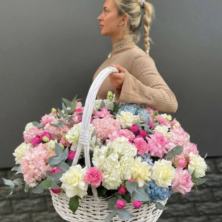 В сезон (весна и лето) ассортимент шире: пионы, ранункулюсы, тюльпаны местные и голландские, ромашки, гортензия. Круглый год — розы от 50 см стебель, кустовые хризантемы, альстромерия, гипсофила, эустома, гвоздики, эвкалипт для миксов.