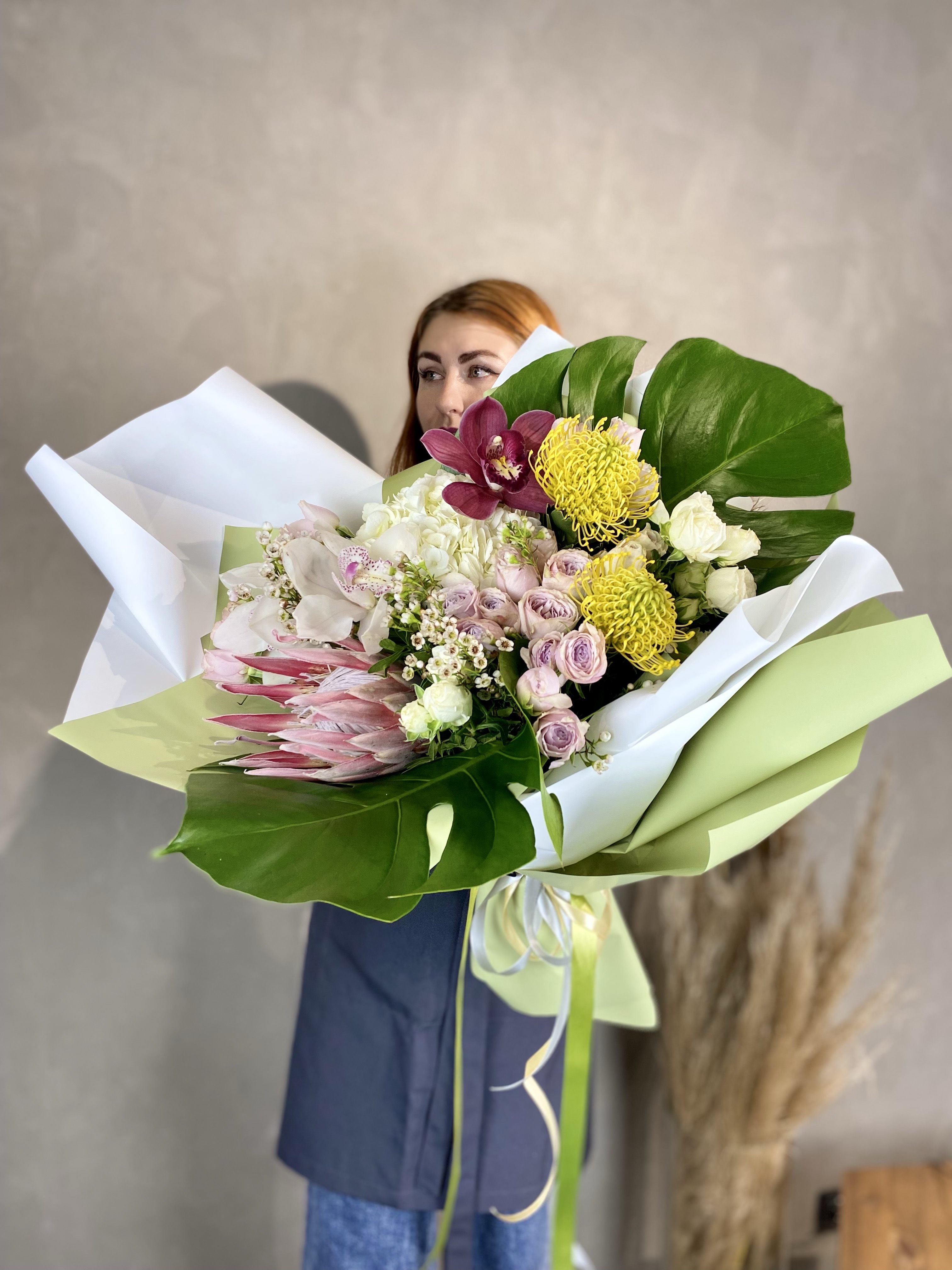 Сто одна кенийская роза в едином цилиндре — это впечатляющий масштаб и безупречная симметрия. Плотный силуэт и насыщенный цвет создают мощное визуальное присутствие. Композиция звучит сама за себя.