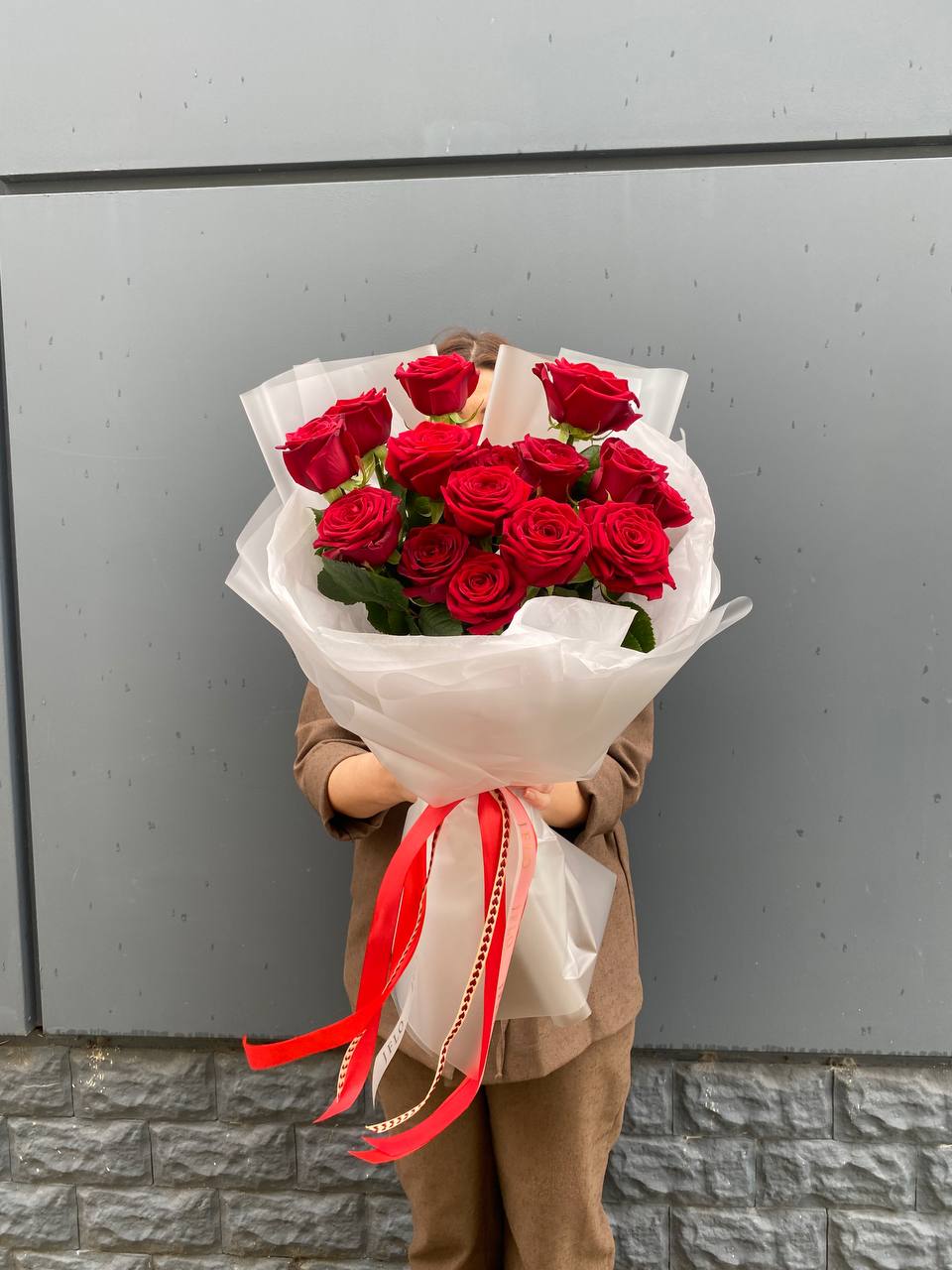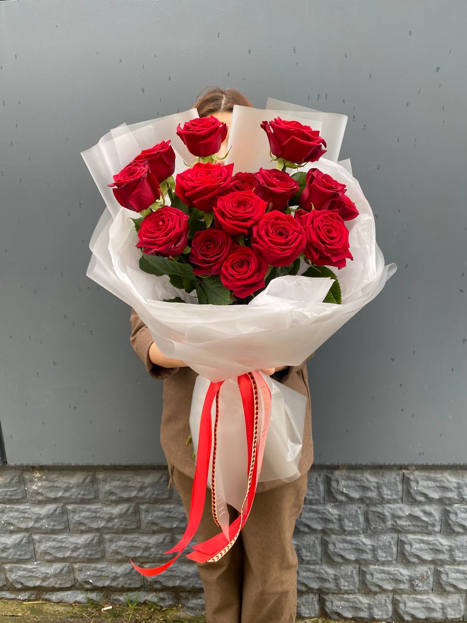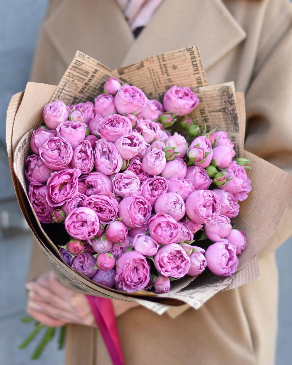 Французские розы Джумилия раскрываются широкими бутонами и формируют яркую композицию из пятнадцати стеблей. Каждый цветок демонстрирует характерную для сорта фактуру с плотными слоями лепестков.