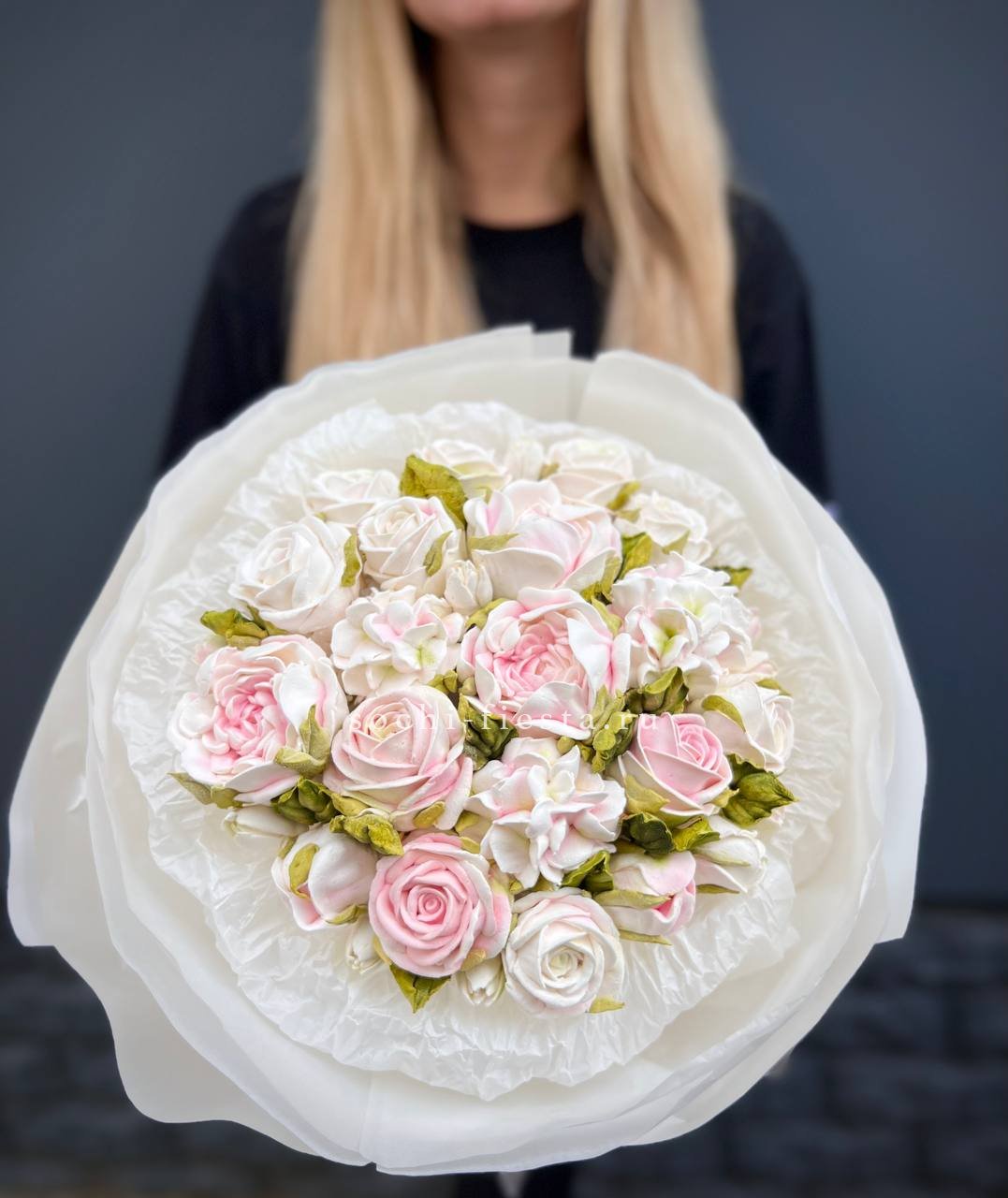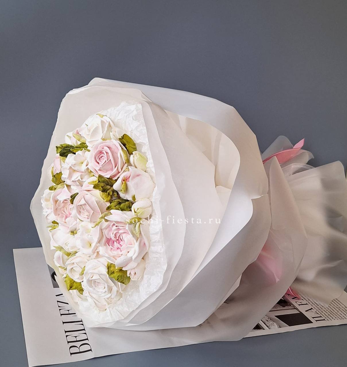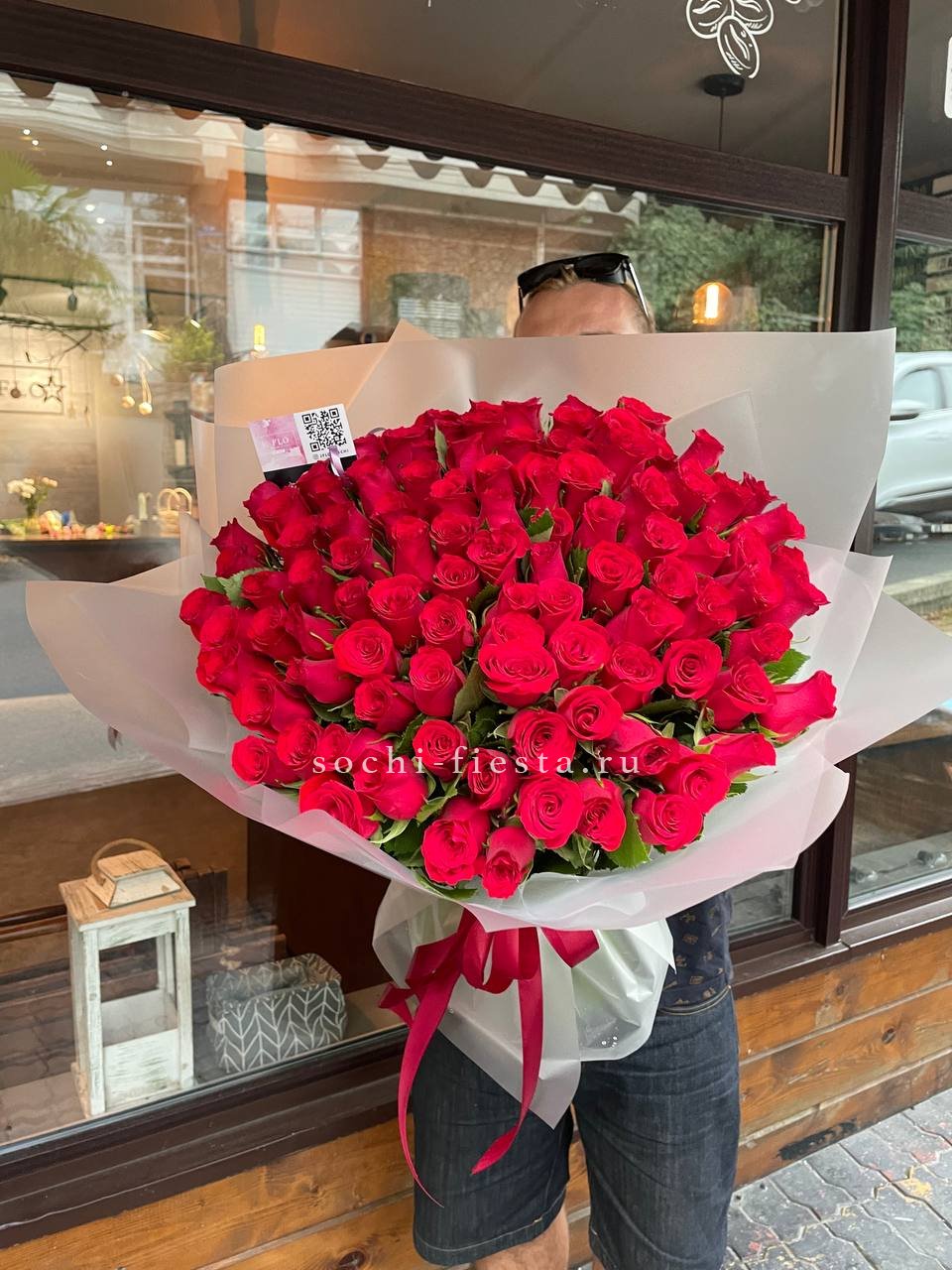 Французские розы Джумилия раскрываются широкими бутонами и формируют яркую композицию из пятнадцати стеблей. Каждый цветок демонстрирует характерную для сорта фактуру с плотными слоями лепестков.