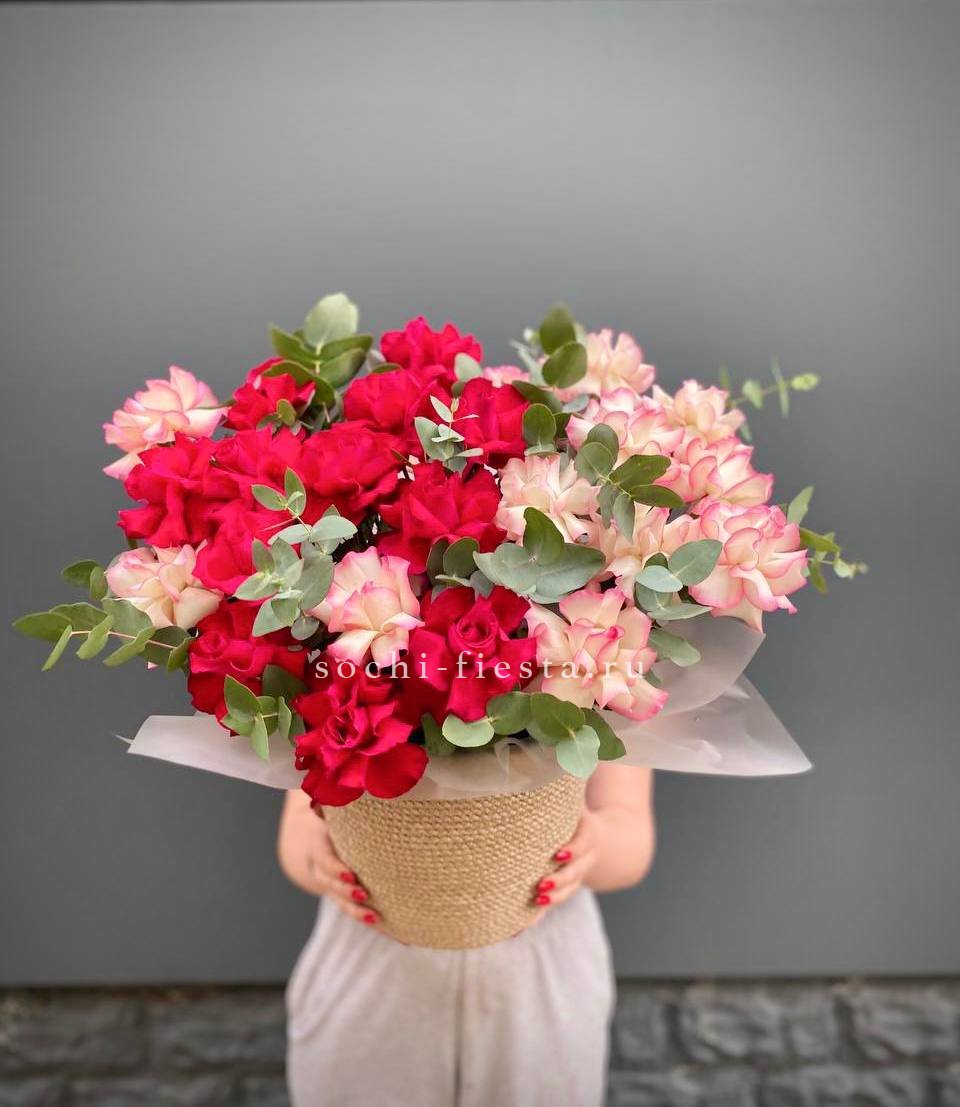 Двадцать пять вывернутых французских роз образуют плотную полусферу насыщенного оттенка. Натуральное джутовое кашпо добавляет композиции природной простоты и завершённости.