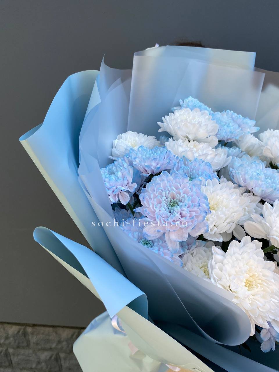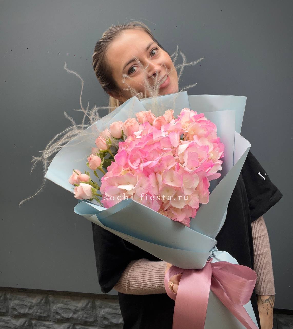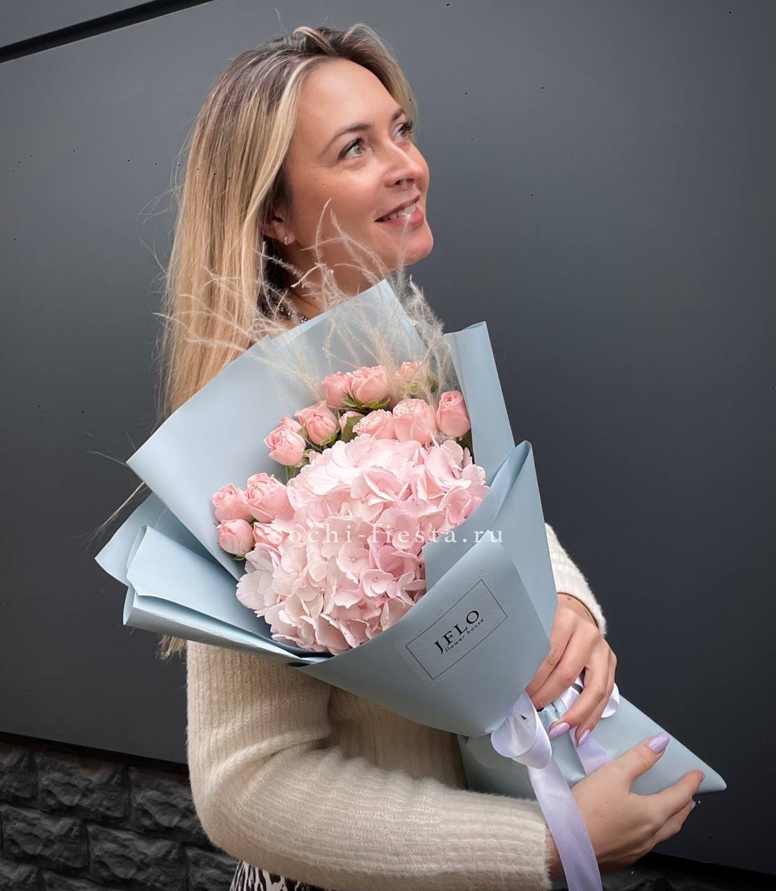 Пять крупных соцветий гортензии в бело-розовой гамме образуют воздушную композицию с переливами света на лепестках. Букет выглядит объёмно и свежо, наполняя пространство мягким цветом.