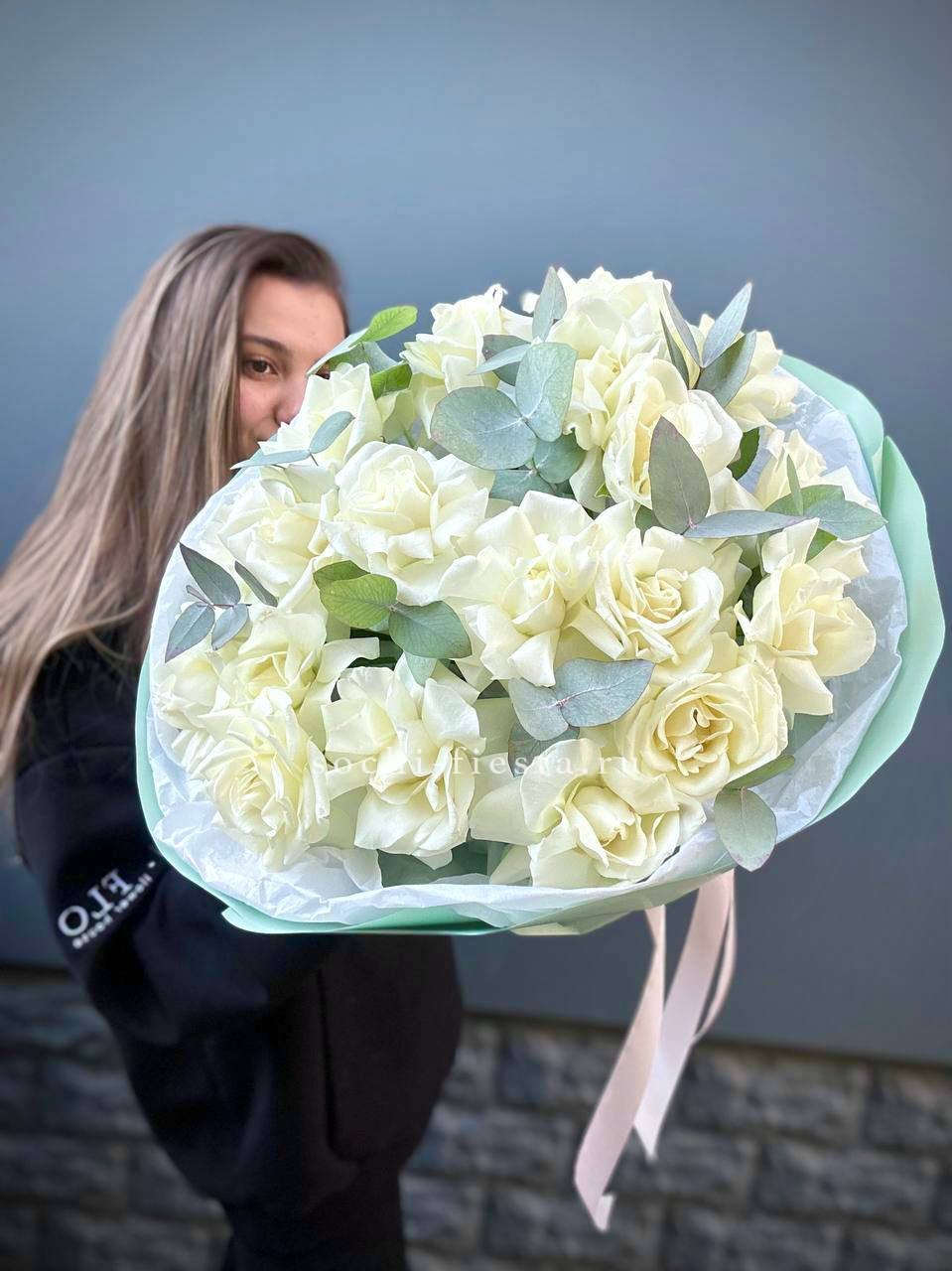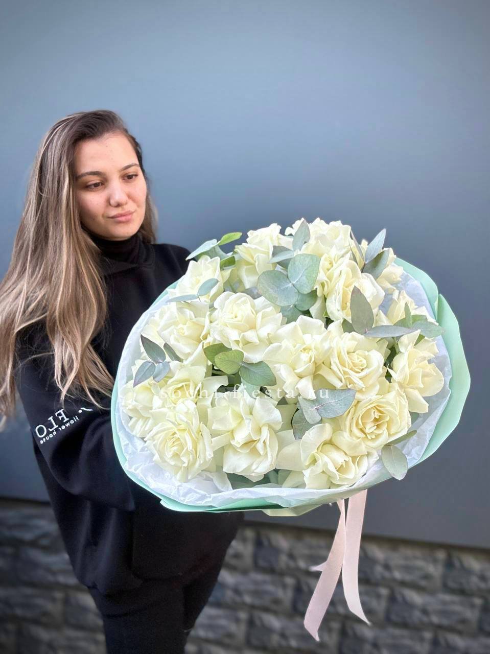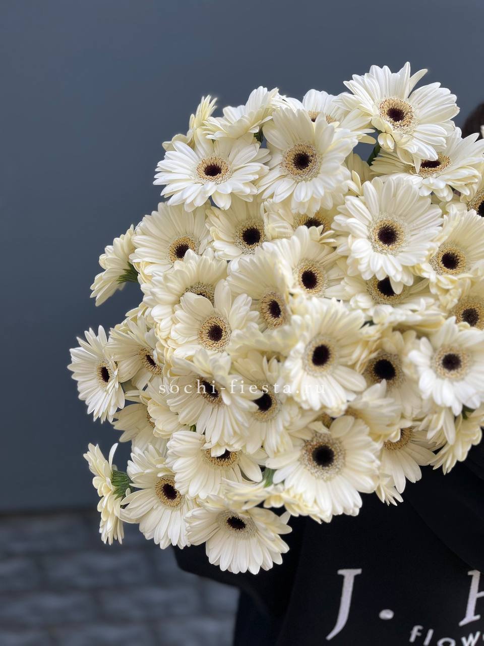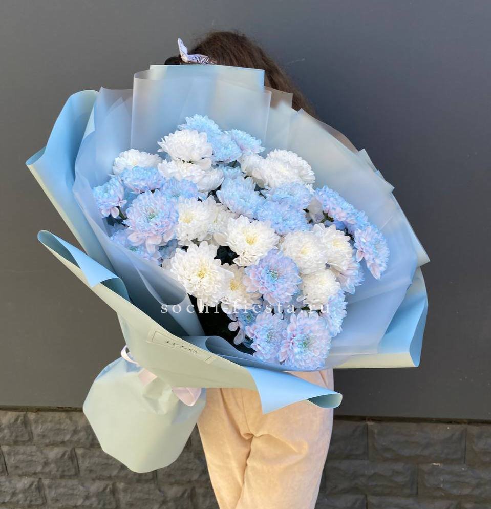 Пять крупных соцветий гортензии в бело-розовой гамме образуют воздушную композицию с переливами света на лепестках. Букет выглядит объёмно и свежо, наполняя пространство мягким цветом.