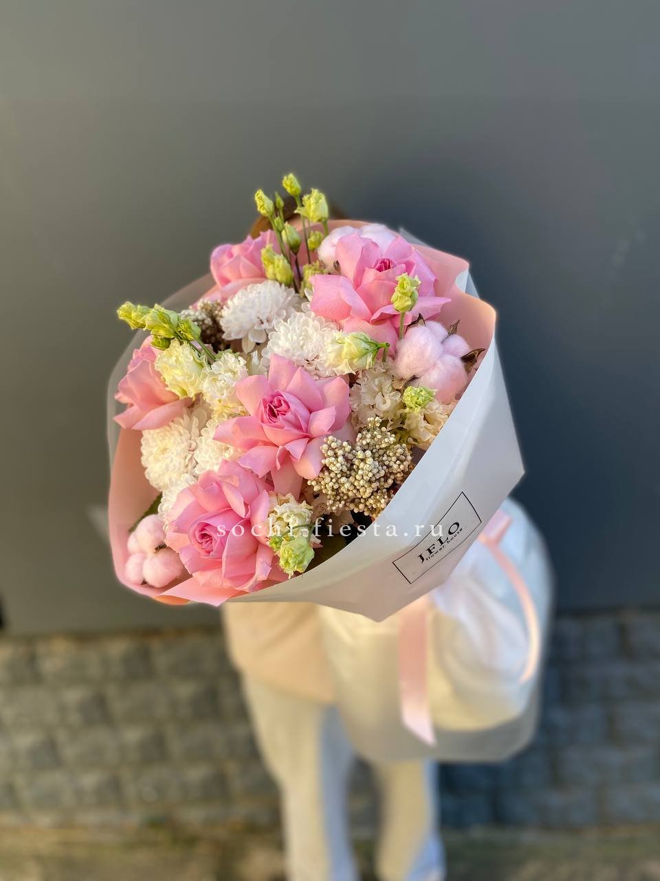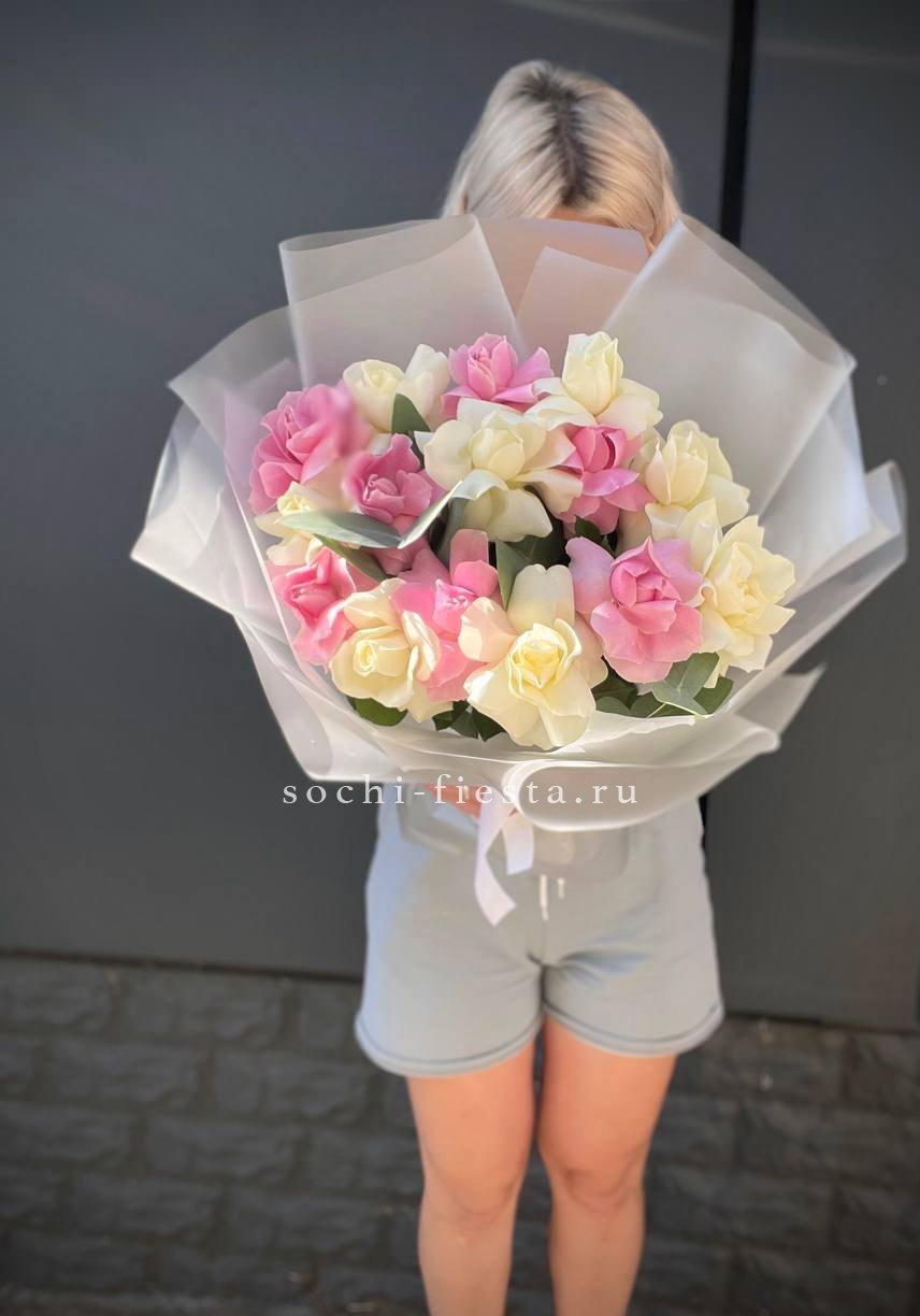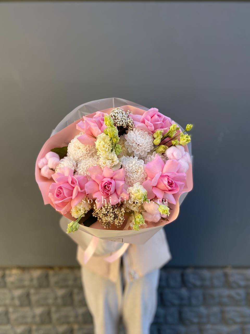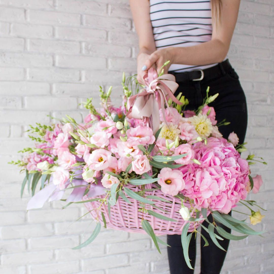 гортензия, вывернутые розы, диантус, кустовая роза, диантусы, оформление в боксе.