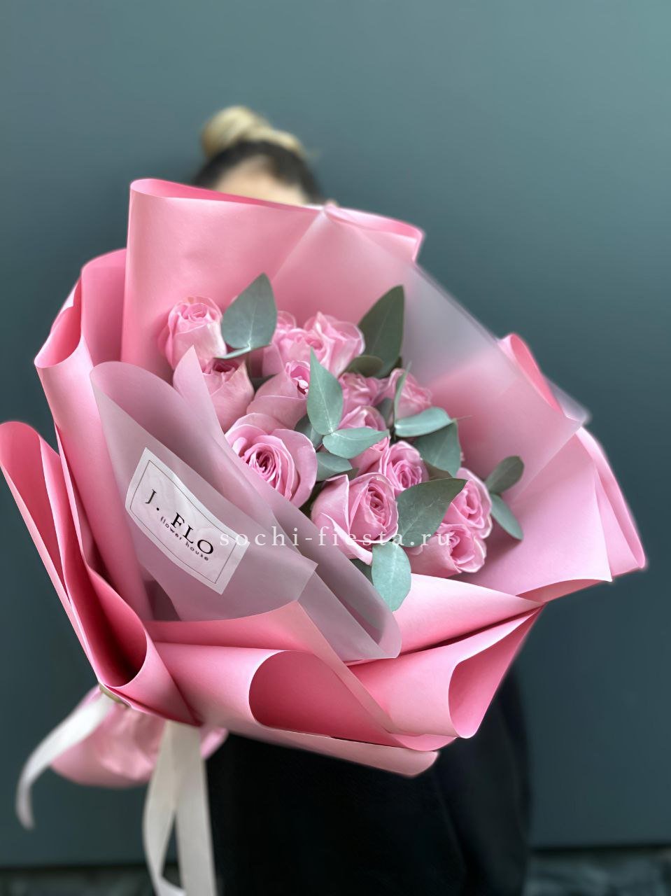 Пятнадцать белых роз в дизайнерской бумаге создают мягкий графичный силуэт. Бутоны собраны плотно с сохранением естественного ритма и воздуха между ними.