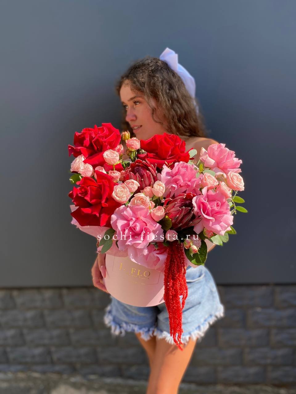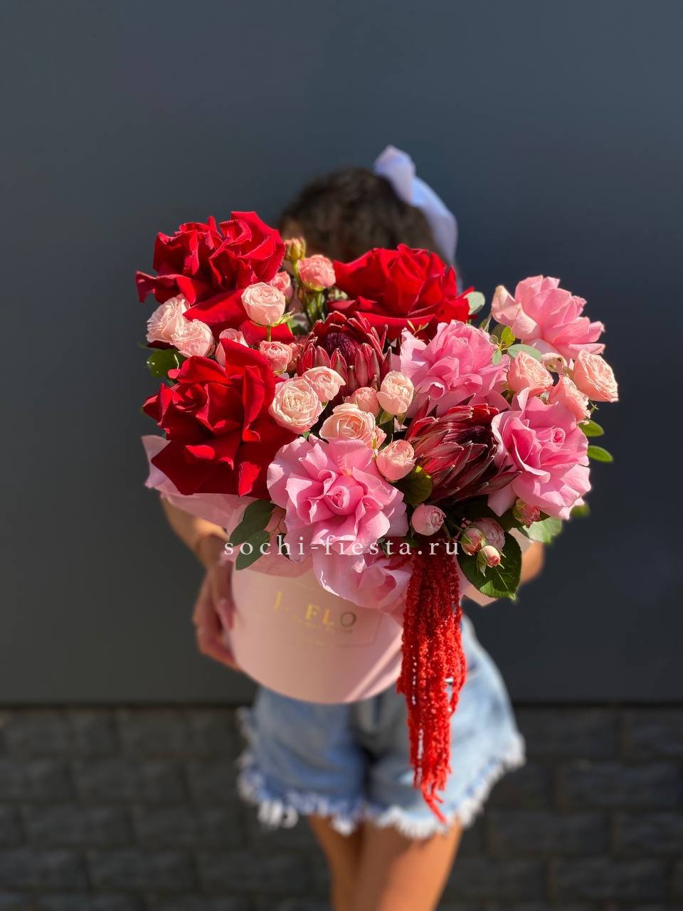 Одиннадцать алых бутонов собраны в плотную вертикальную форму с добавлением воздушного лимониума. Букет держит линию и создает яркое присутствие в любом пространстве.