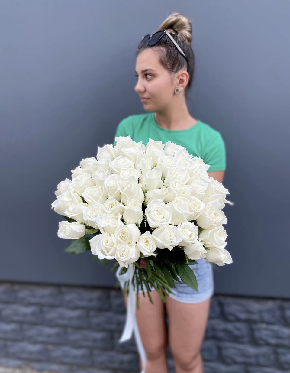 Пионовидные розы раскрываются густыми лепестками, хамелациум добавляет воздушности. Композиция держит форму и долго сохраняет свежесть.