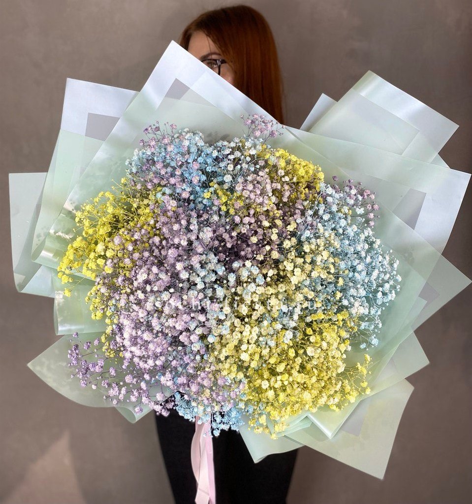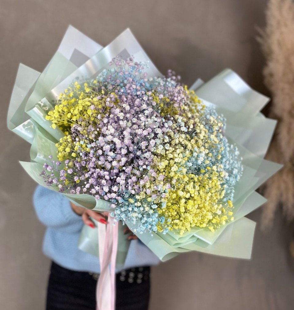 Одиннадцать ветвей радужной гипсофилы создают воздушное облако с переливами цвета. Яркая палитра и объёмная структура делают композицию заметной в любом пространстве.