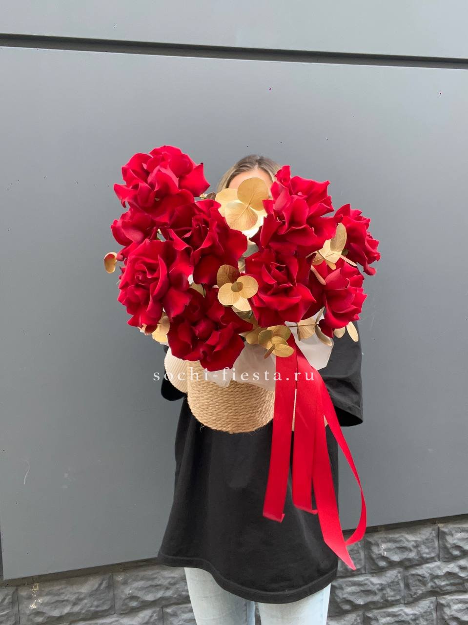 Красные французские розы в джутовом кашпо