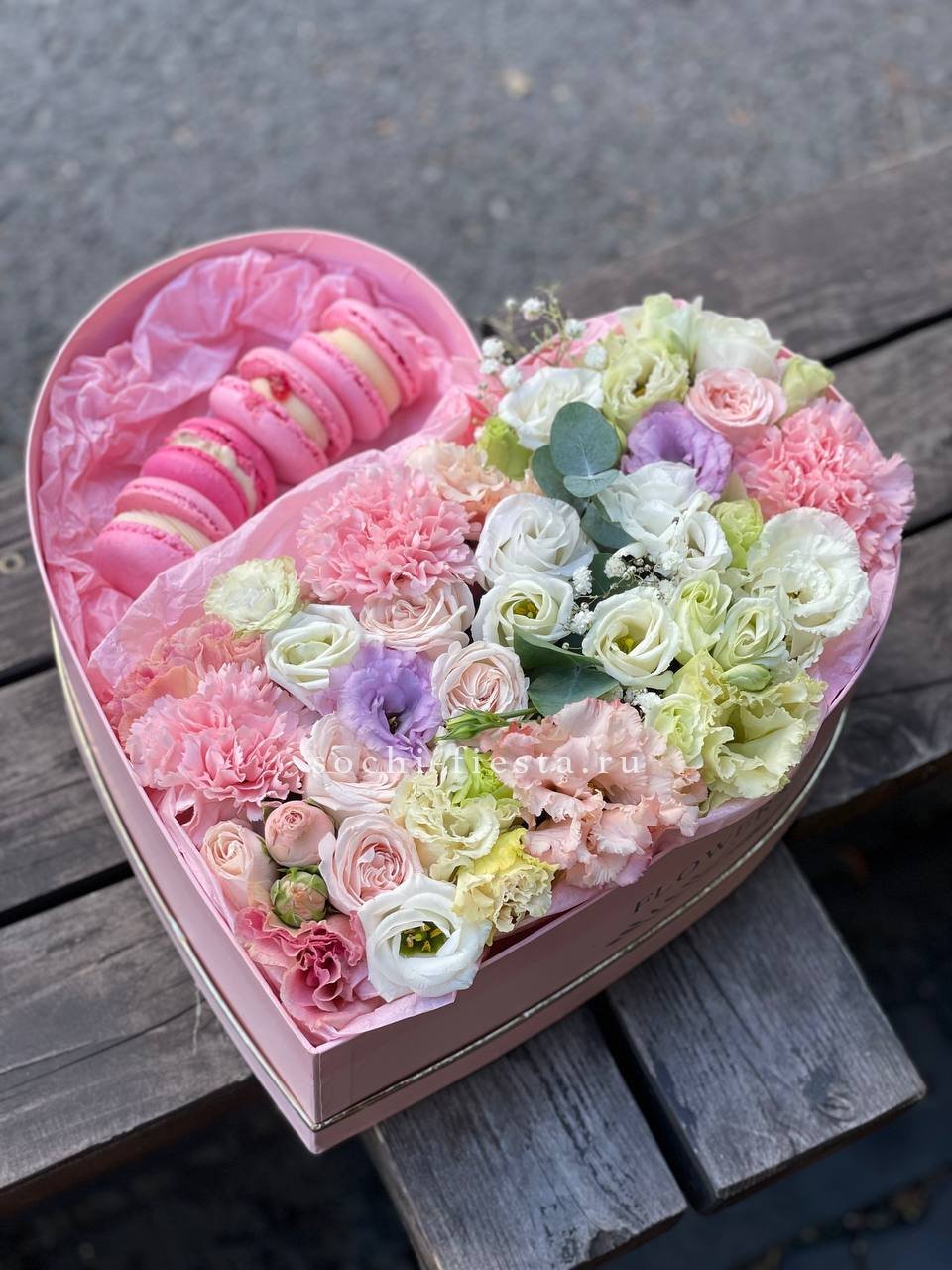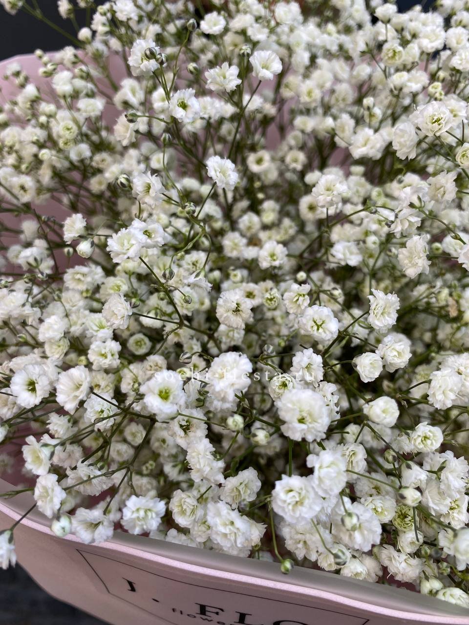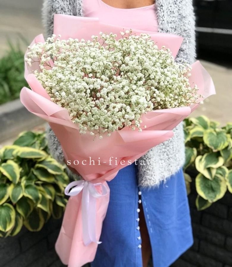 Пять веток радужной гипсофилы закреплены в форме сердца на флористической основе. Компактная композиция с яркими переливами держит заданный силуэт.