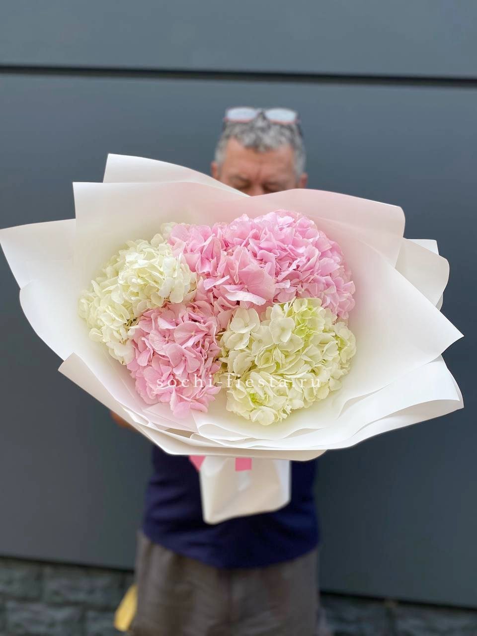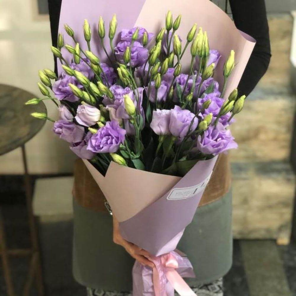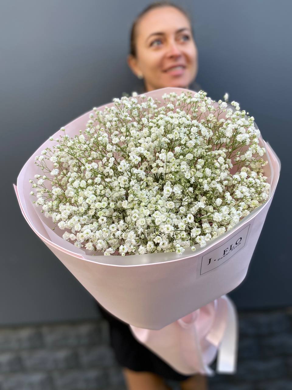 Пять веток радужной гипсофилы закреплены в форме сердца на флористической основе. Компактная композиция с яркими переливами держит заданный силуэт.