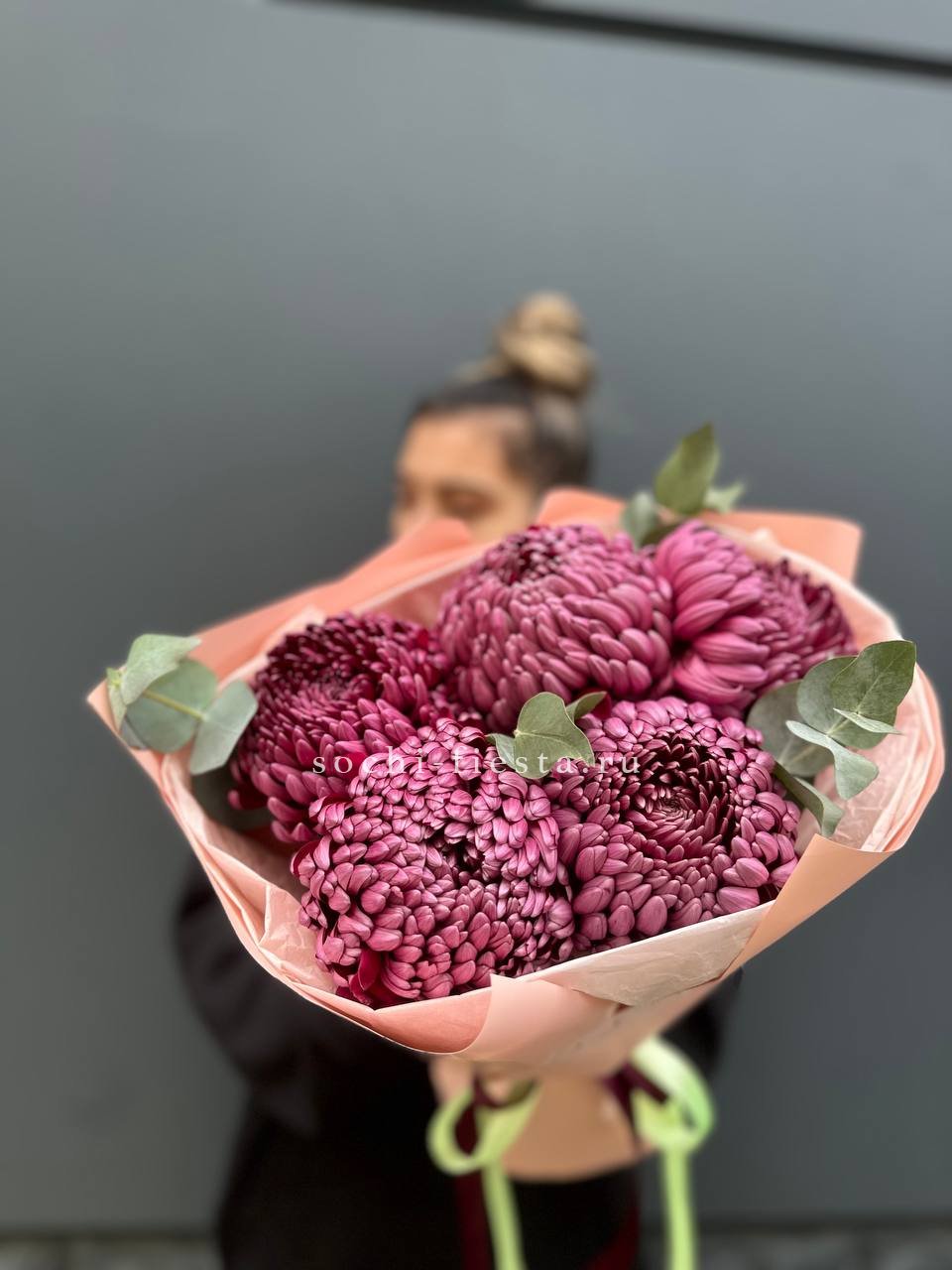 Хризантемы сорта Бигуди с игольчатыми лепестками выглядят как живая графика. Эвкалипт добавляет серебристые ноты и усиливает фактурную игру. Композиция для тех, кто любит необычные формы в природе.