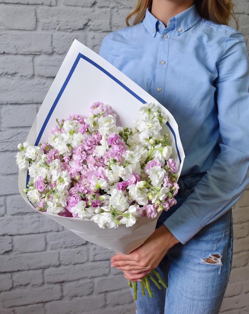 Пятнадцать стеблей маттиолы раскрываются пастельными оттенками и наполняют комнату весенним ароматом. Букет выглядит свежо и создаёт ощущение тёплого утра в саду.