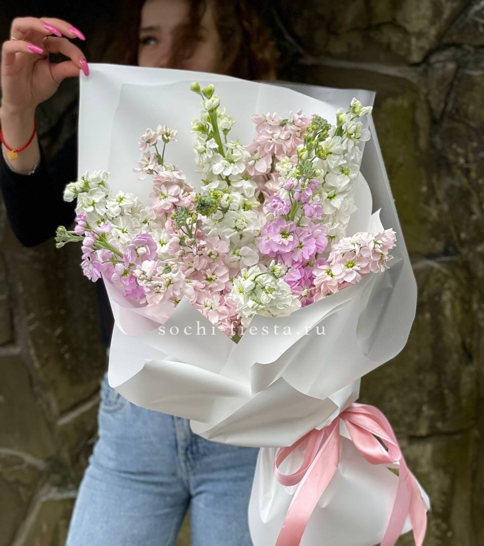 Тринадцать веток маттиолы с густыми соцветиями и бархатными лепестками. Букет компактный, но с заметным присутствием благодаря насыщенному цвету и волнам аромата, которые распространяются мгновенно.