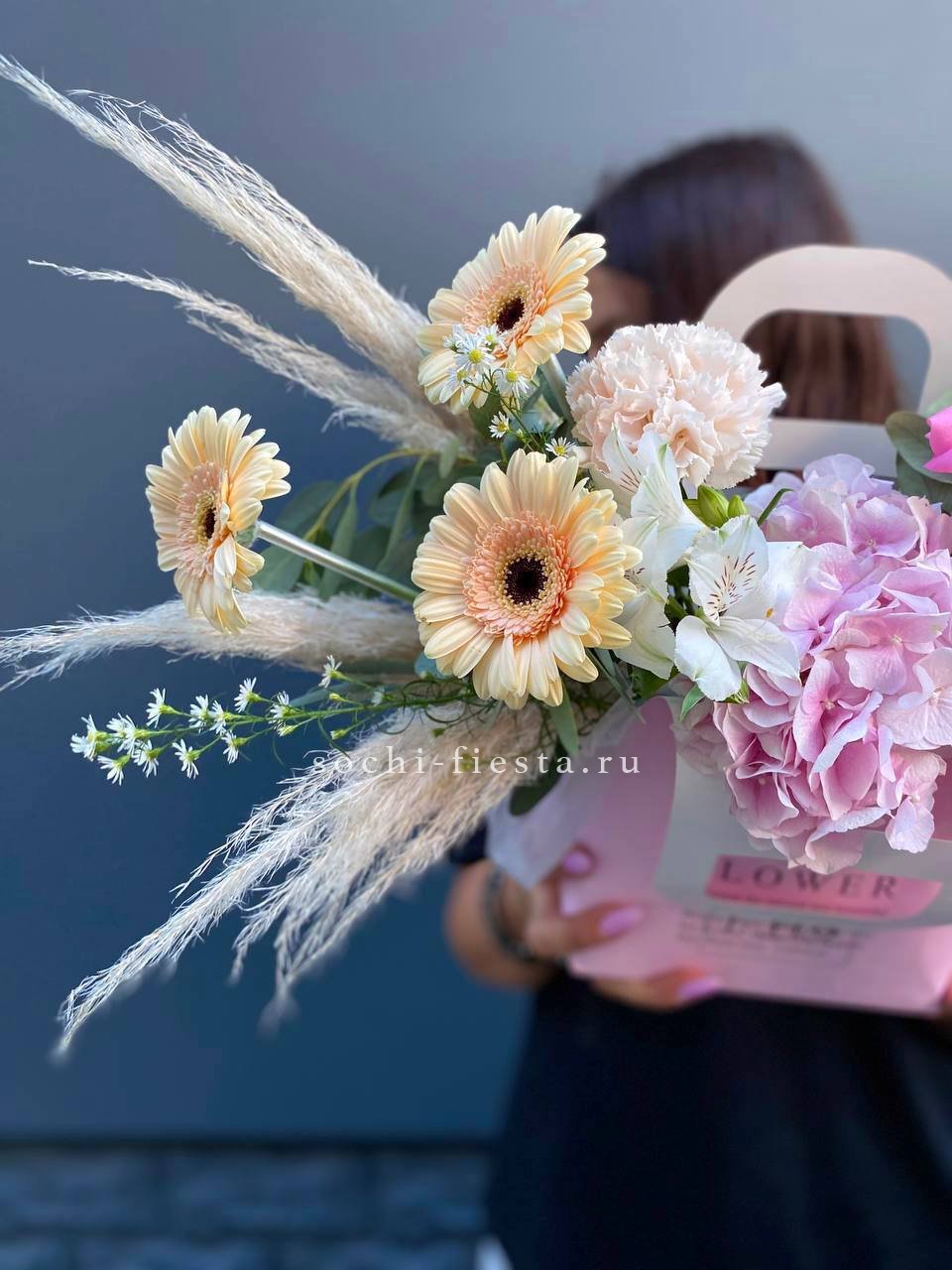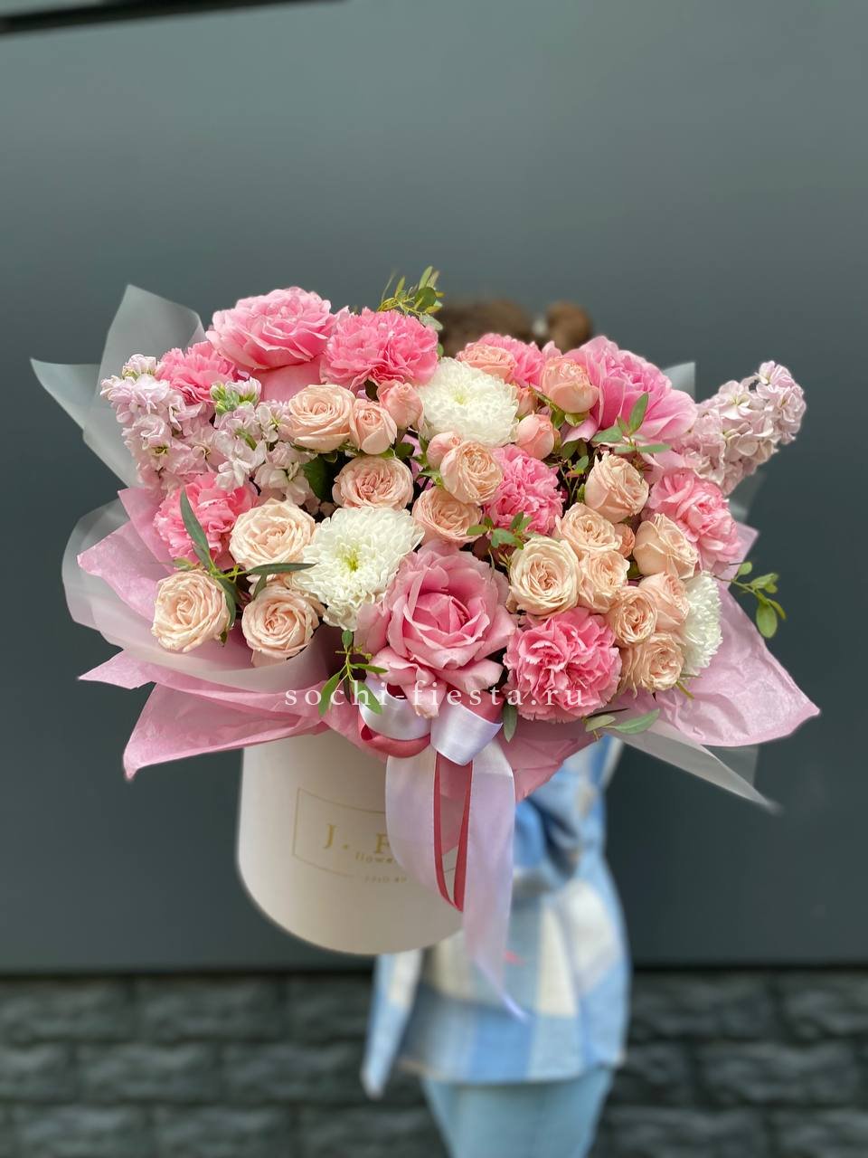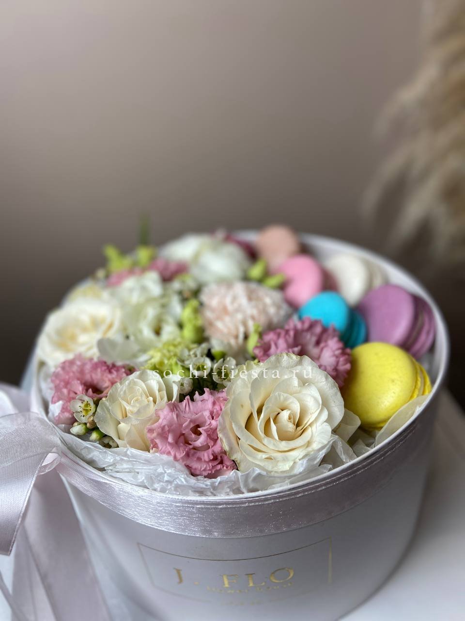 Компактная композиция в цилиндре объединяет воздушную гипсофилу, бутоны эустомы и розы в пастельной гамме Прованса. Диантусы добавляют фактурные акценты, а шесть макаронс завершают образ.