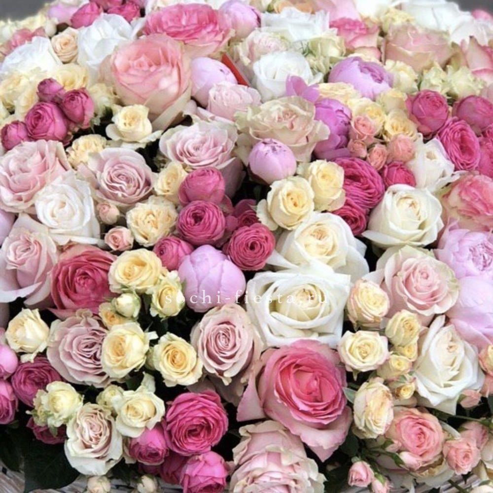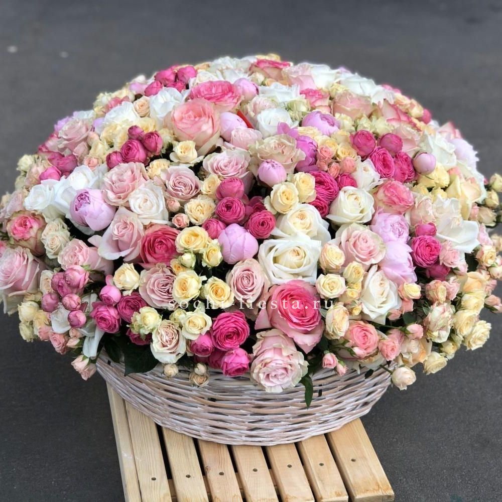Цветочная корзина из пионов и пионовидных роз "Юниверсити"