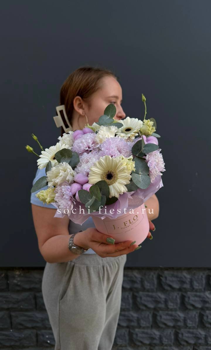 Эустомы и пионовидные розы соседствуют с французскими макарон в коробке в форме сердца. Диантусы и эвкалипт создают объём, а сладкий акцент делает композицию завершённой.