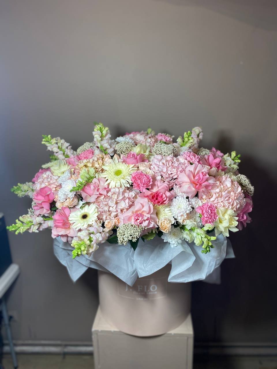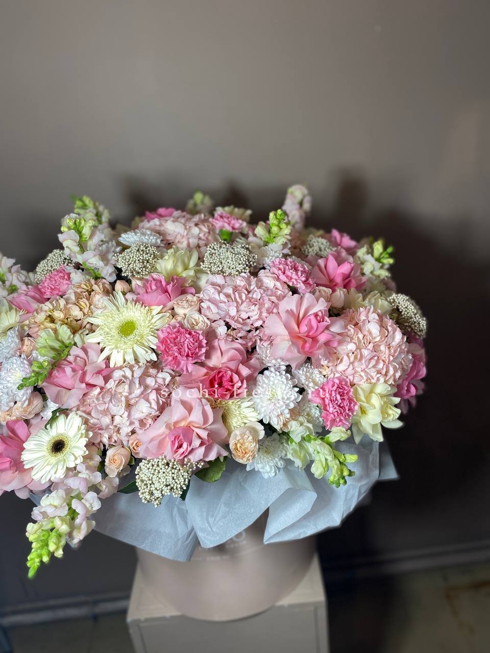 цветочная композиция в нежно-розовых тонах в цилиндре D25.