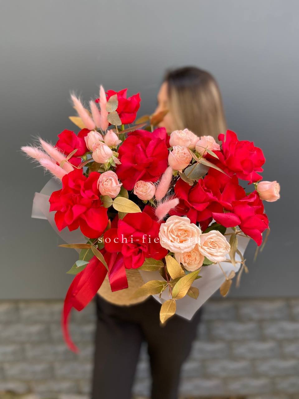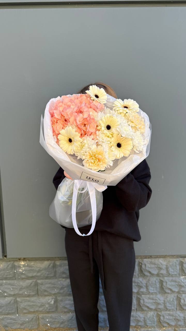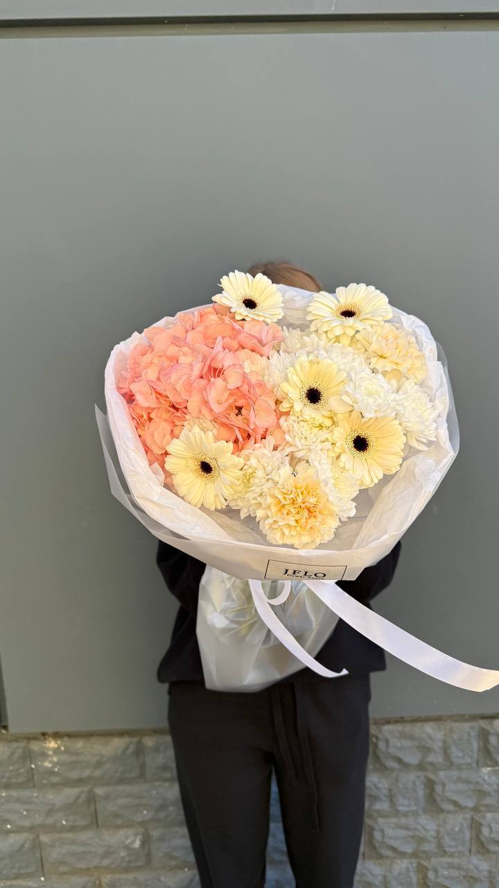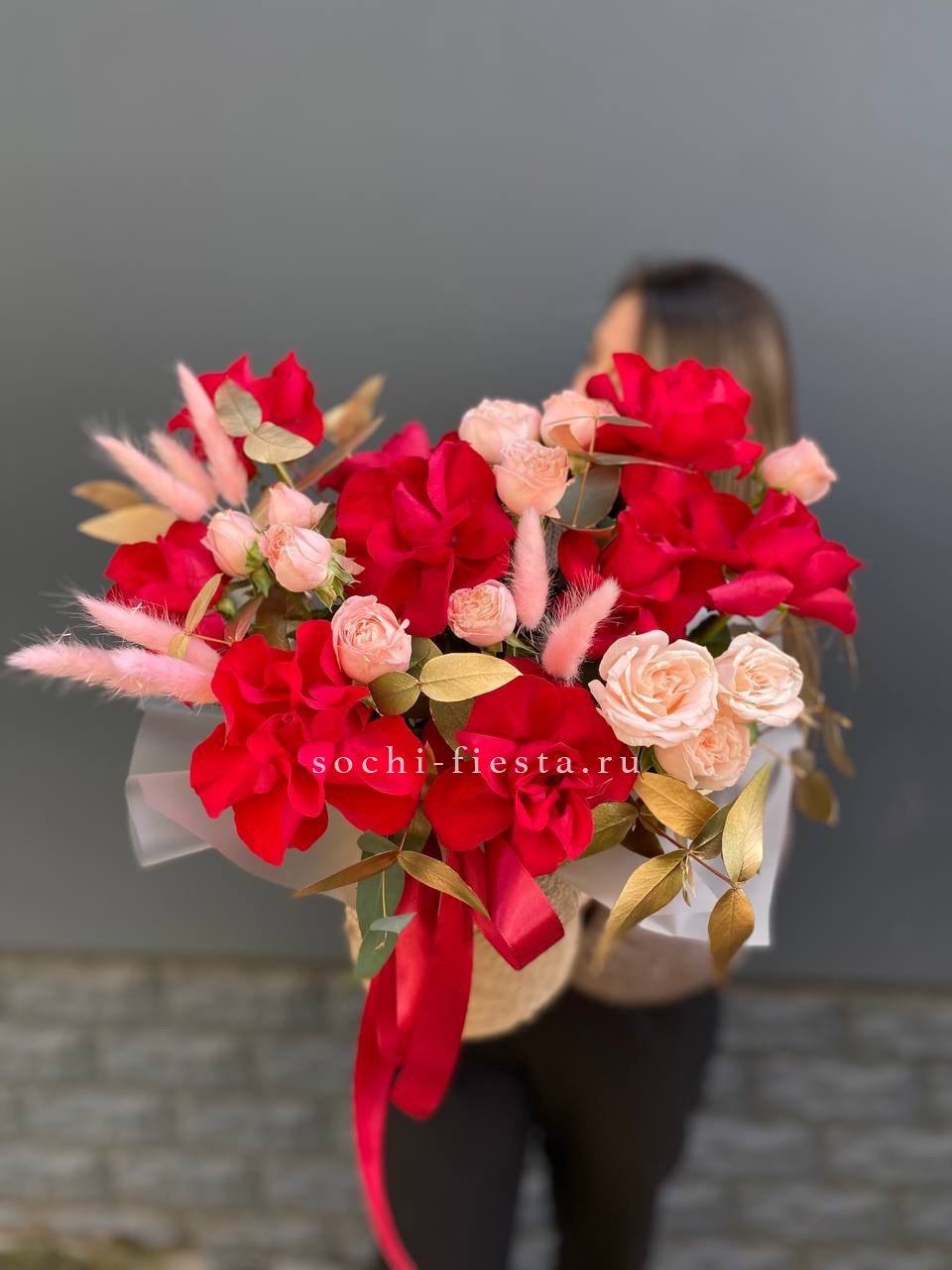 Белоснежные розы и герберы выстраивают чистую цветовую гамму с яркими акцентами диантусов. Эвкалипт вносит графичность и природную фактуру в общую композицию.