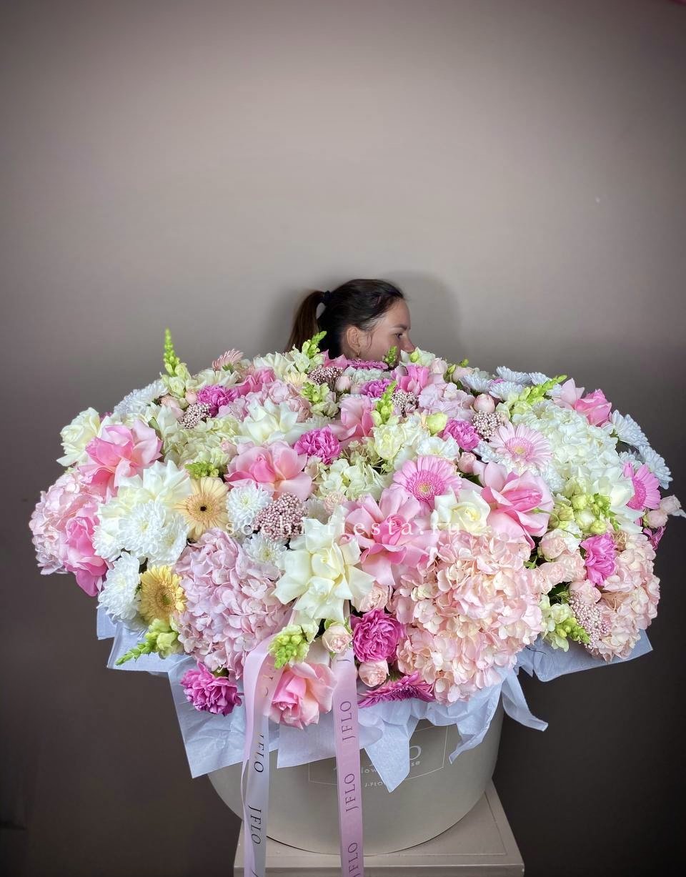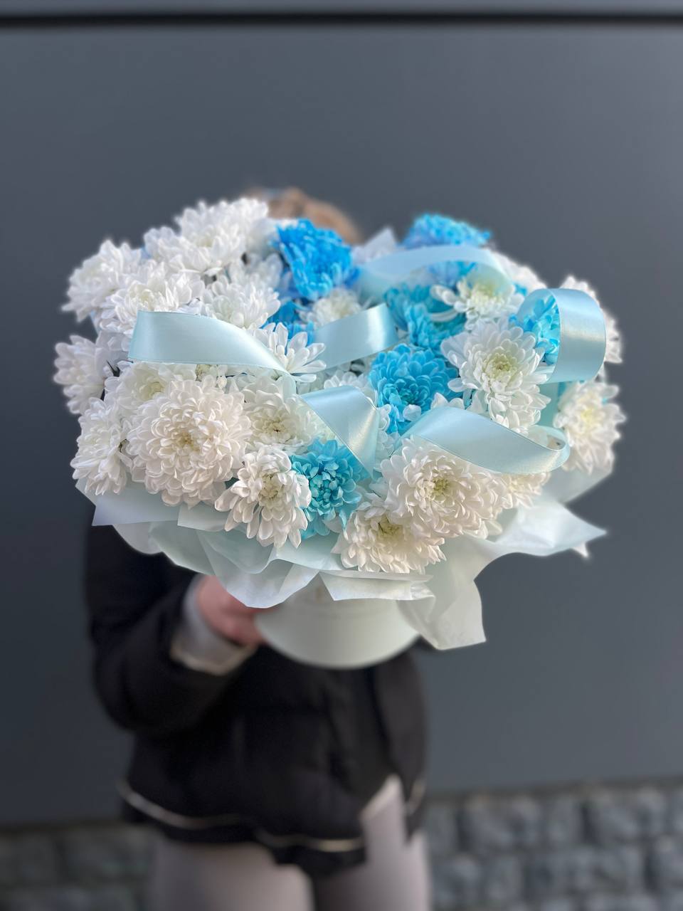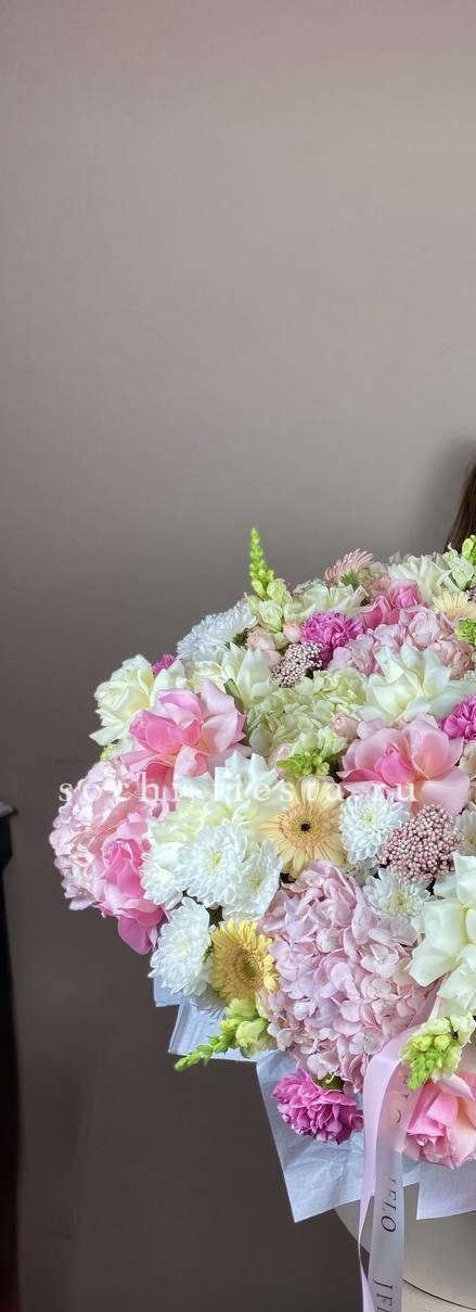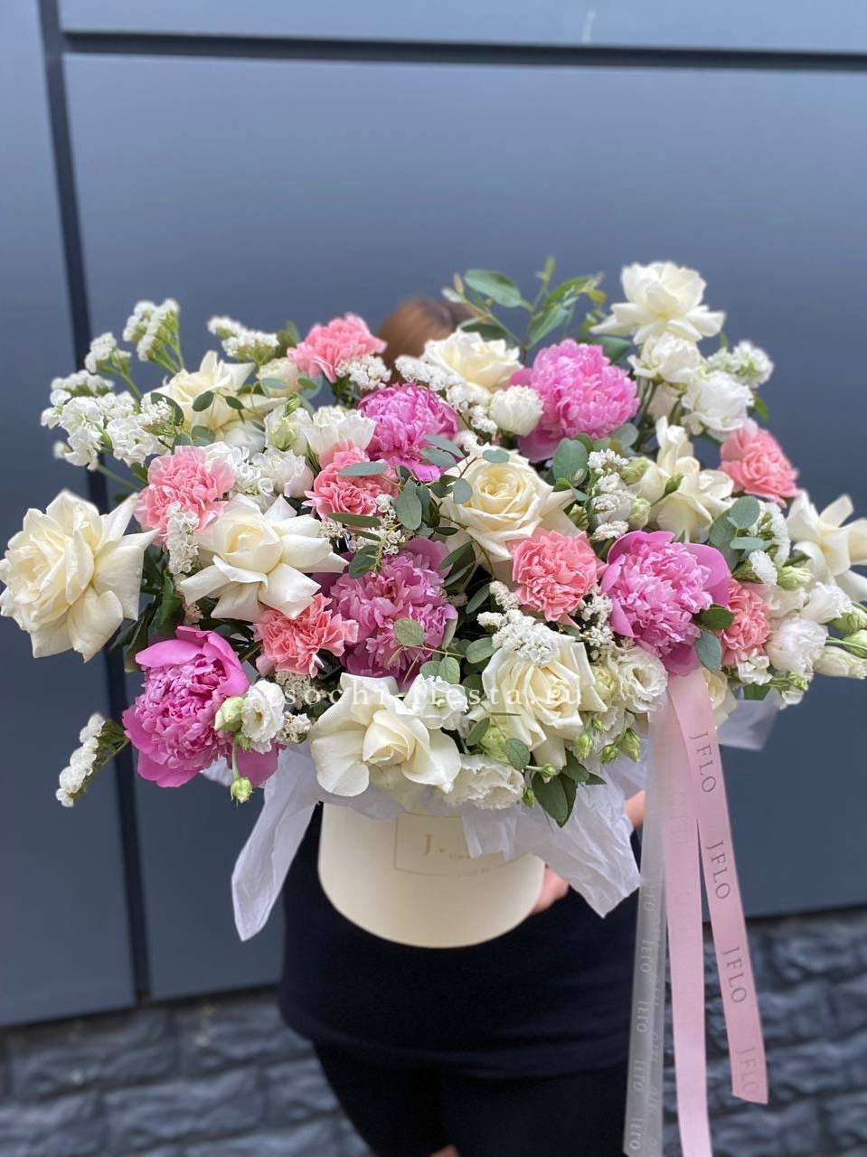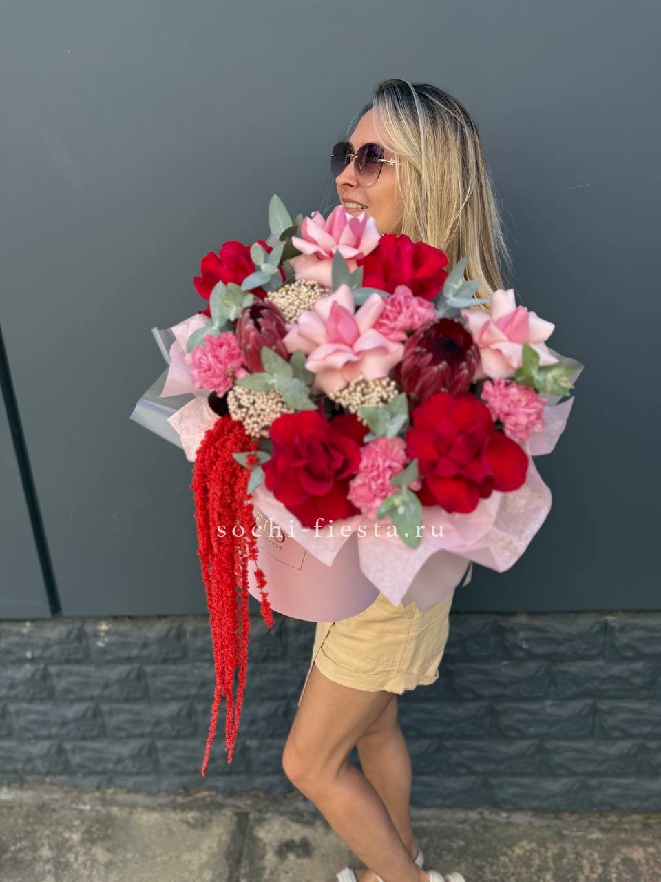 Белоснежные розы и герберы выстраивают чистую цветовую гамму с яркими акцентами диантусов. Эвкалипт вносит графичность и природную фактуру в общую композицию.