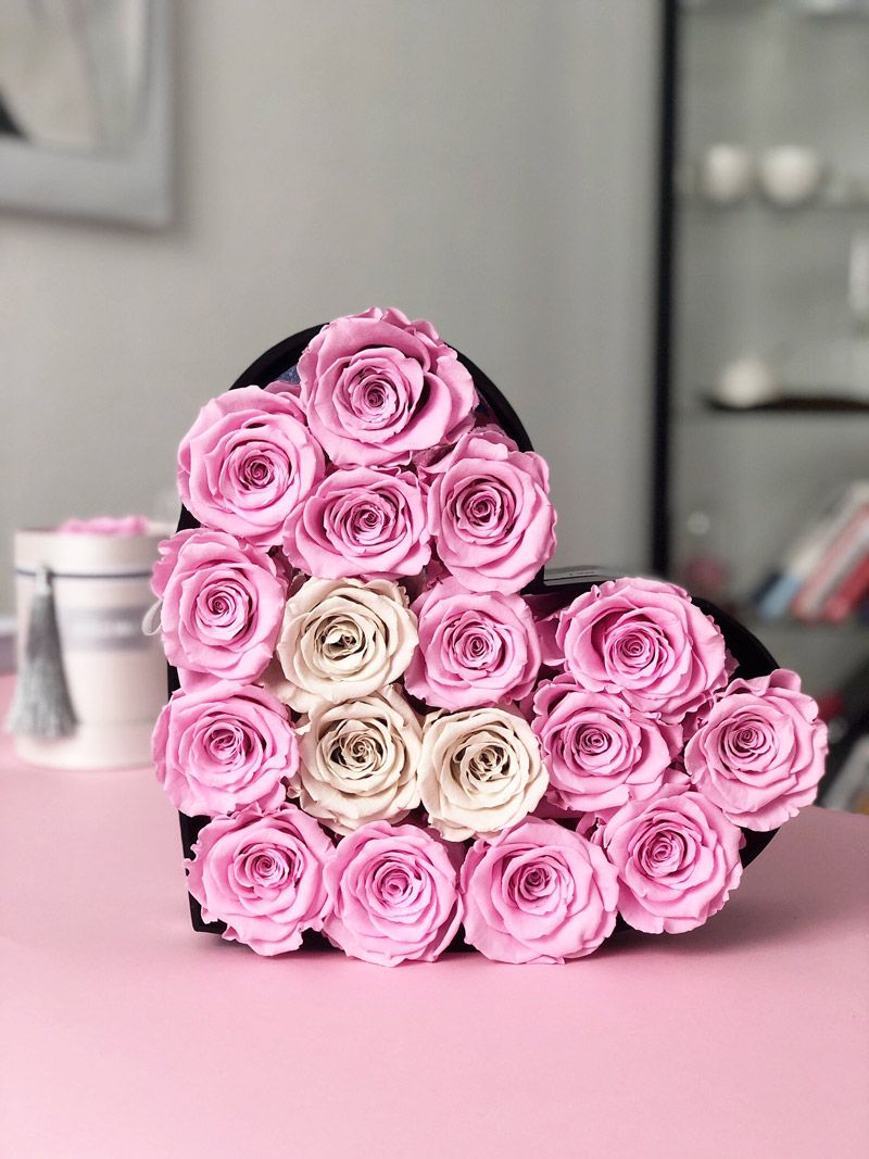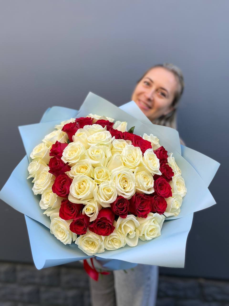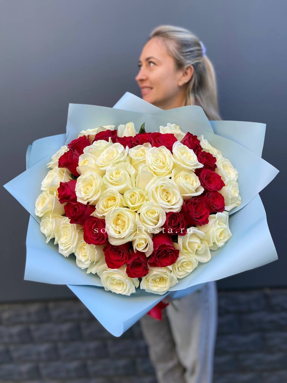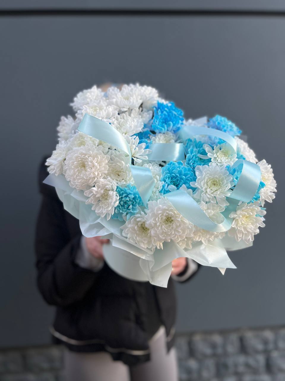 Белоснежные розы и герберы выстраивают чистую цветовую гамму с яркими акцентами диантусов. Эвкалипт вносит графичность и природную фактуру в общую композицию.