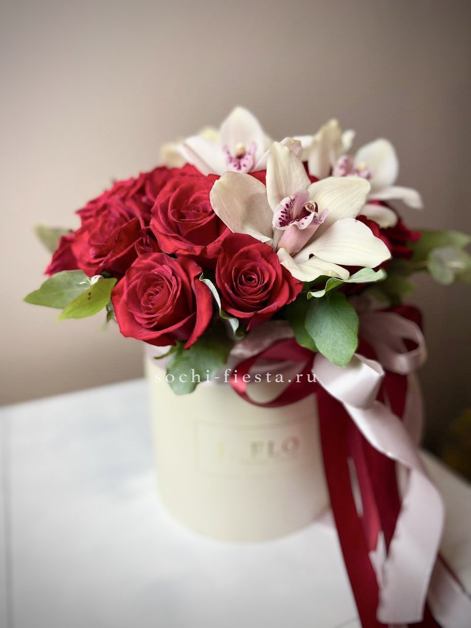 роза кустовая, эустома, диантус,  эвкалипт, 5 макаронс, белый цилиндр D15 Цвет коробки может быть согласован с клиентом.  Наполнение может меняться по наличию.