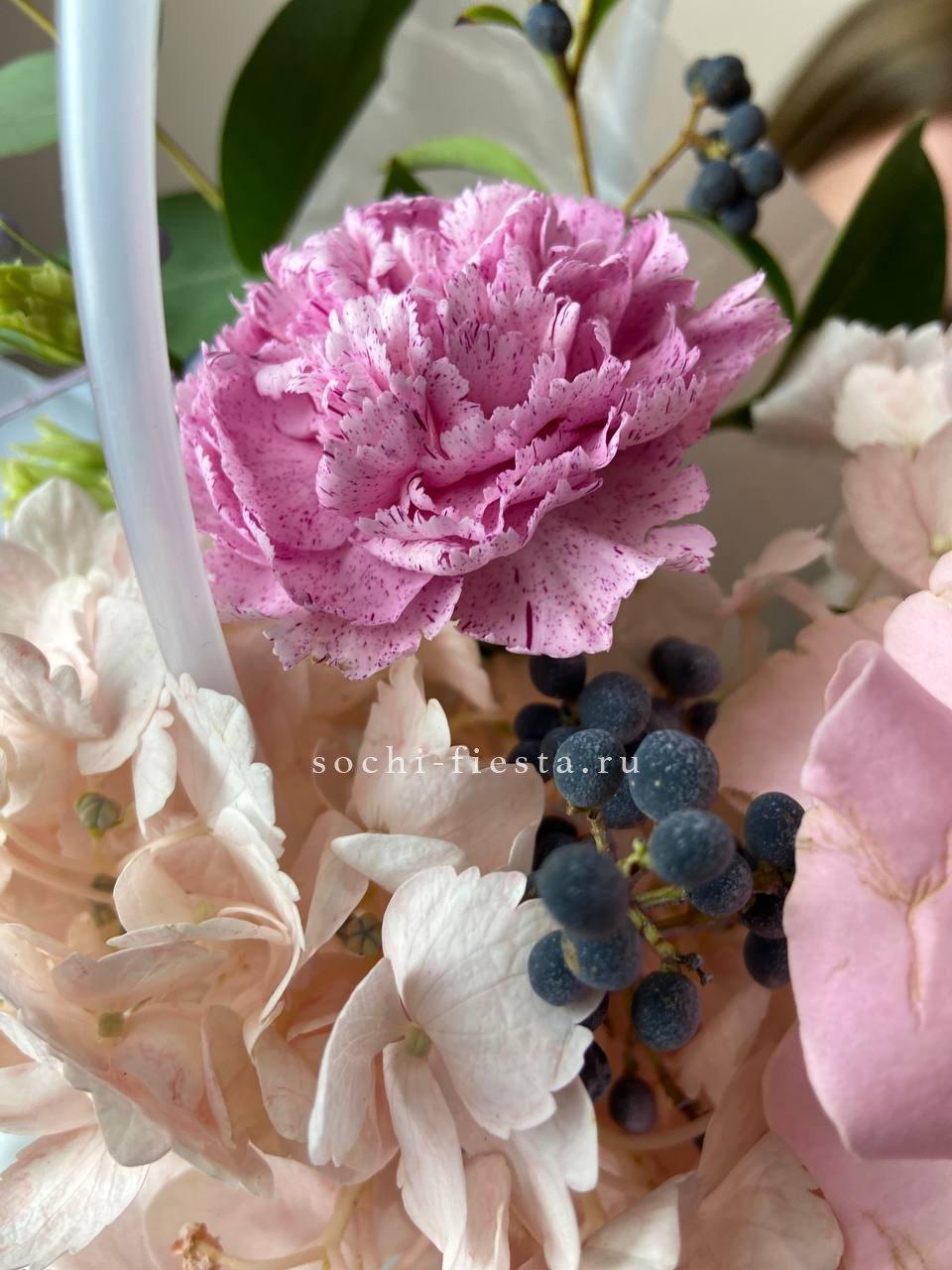 Хризантемы и маттиола собраны в компактную форму с лиловыми переливами. Статица добавляет воздушности, а сумочка делает композицию мобильной и готовой к вручению. Цветы закреплены в оазисе для длительной свежести.