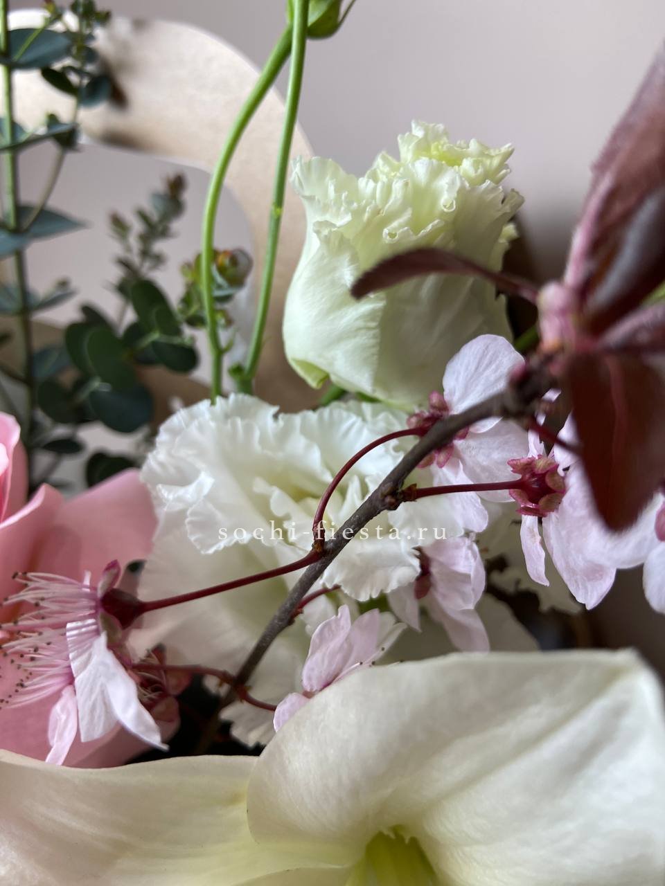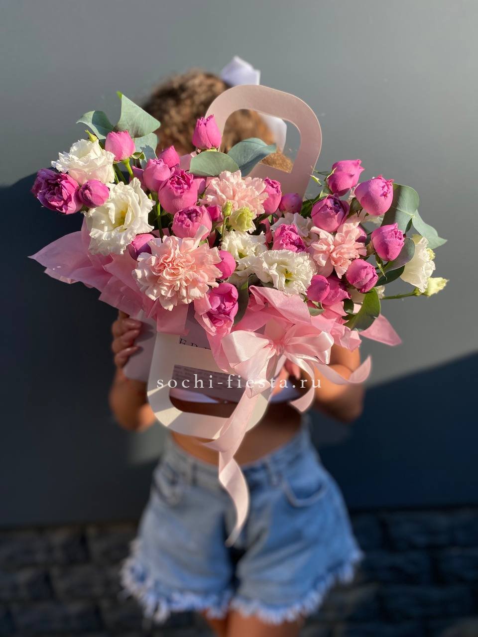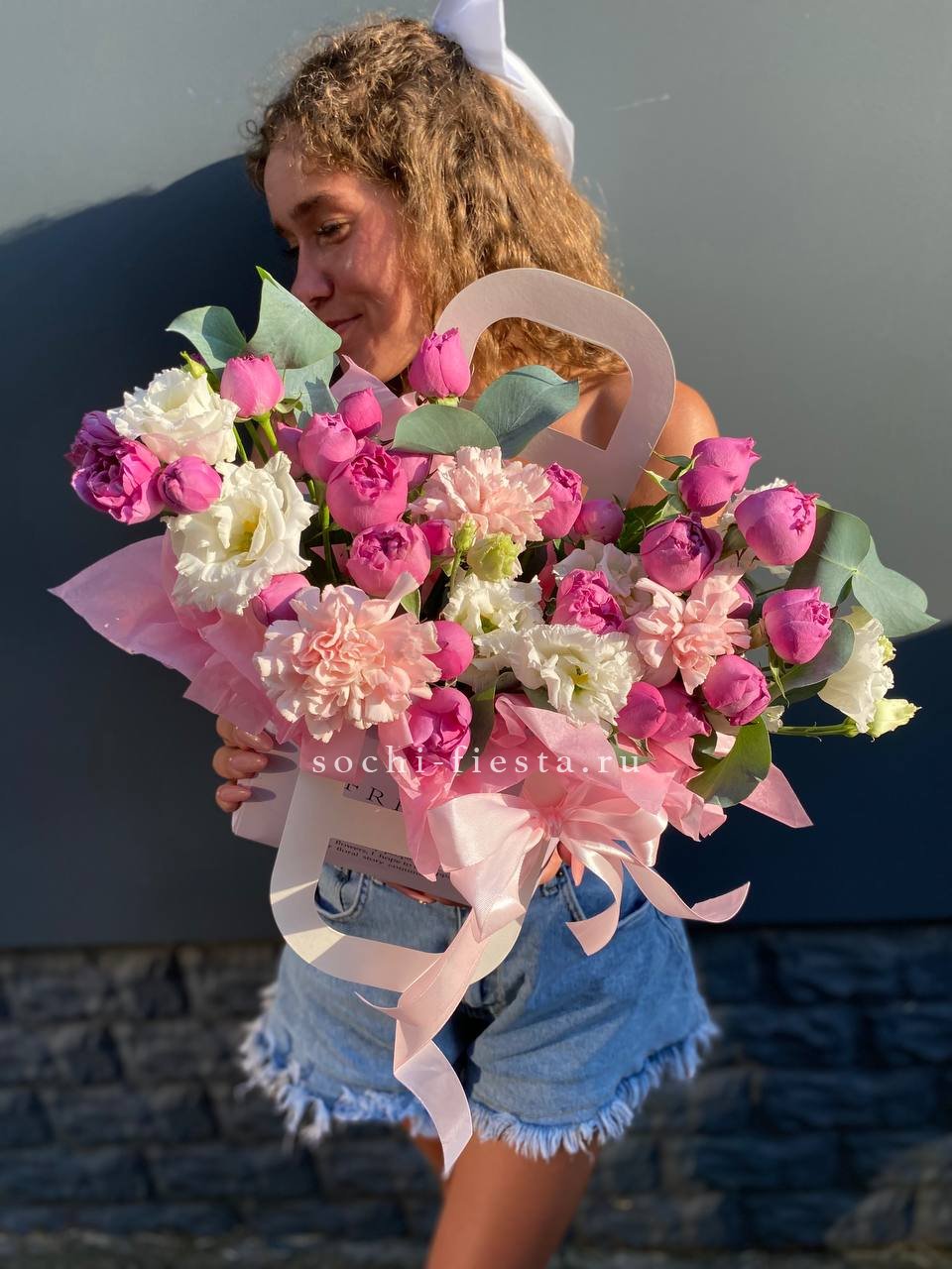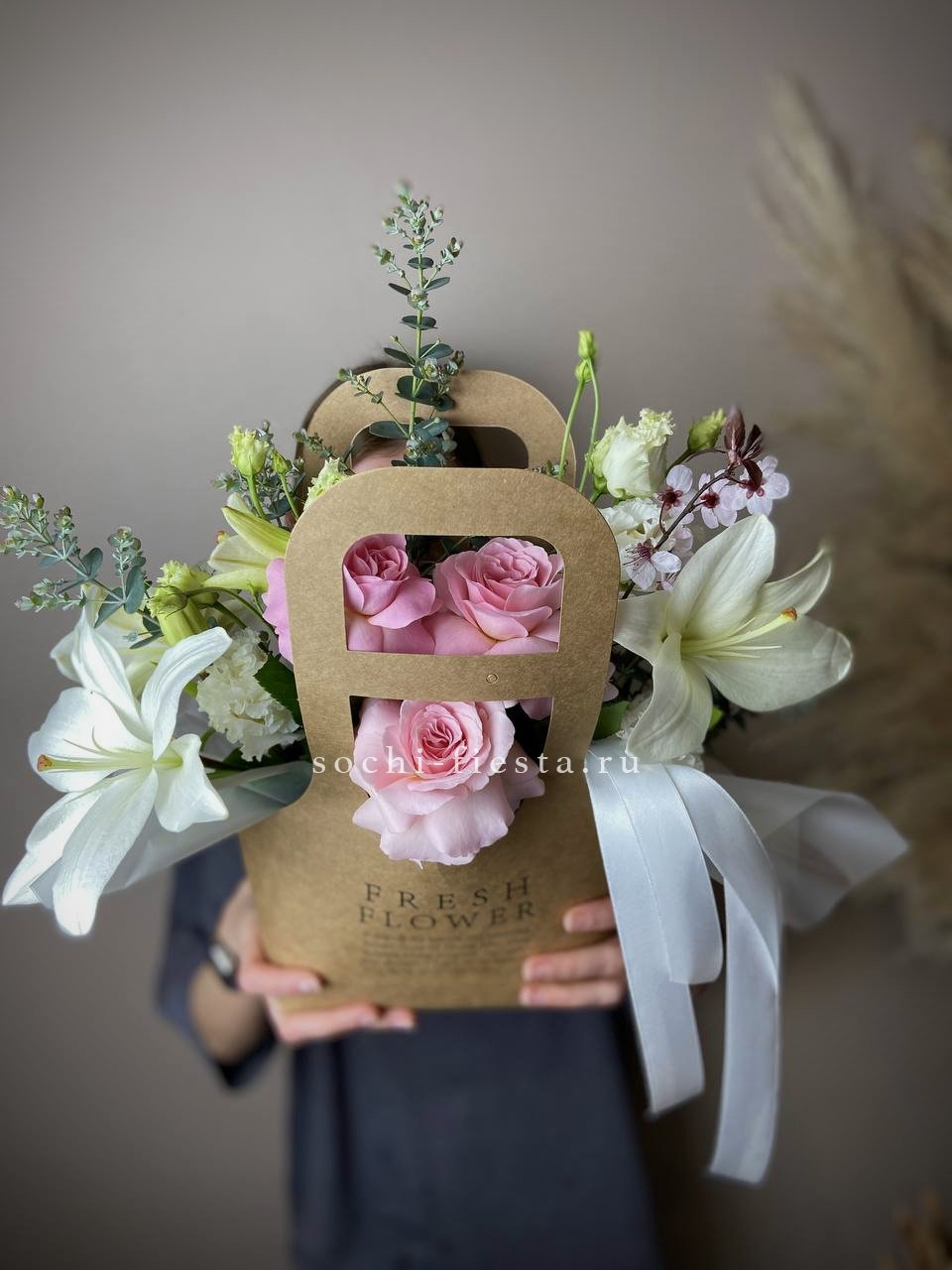Белые розы и хризантемы сочетаются с воздушной эустомой и хлопком в сумочке. Светлая гамма с прохладным оттенком напоминает морскую свежесть и создает спокойное настроение.