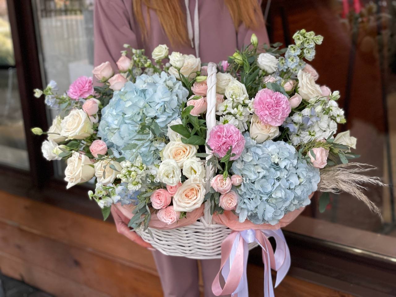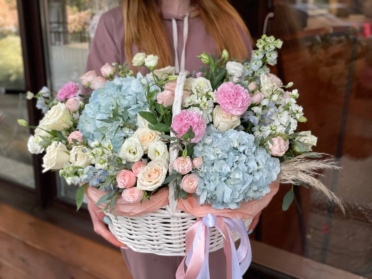 Пятьсот пятьдесят пять роз в корзине с персональной надписью — это целая инсталляция из живых цветов. Объём композиции впечатляет масштабом и создаёт незабываемое визуальное присутствие.