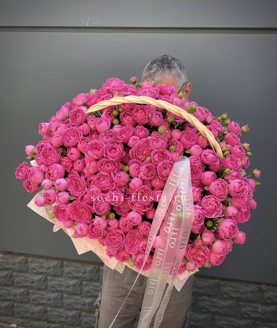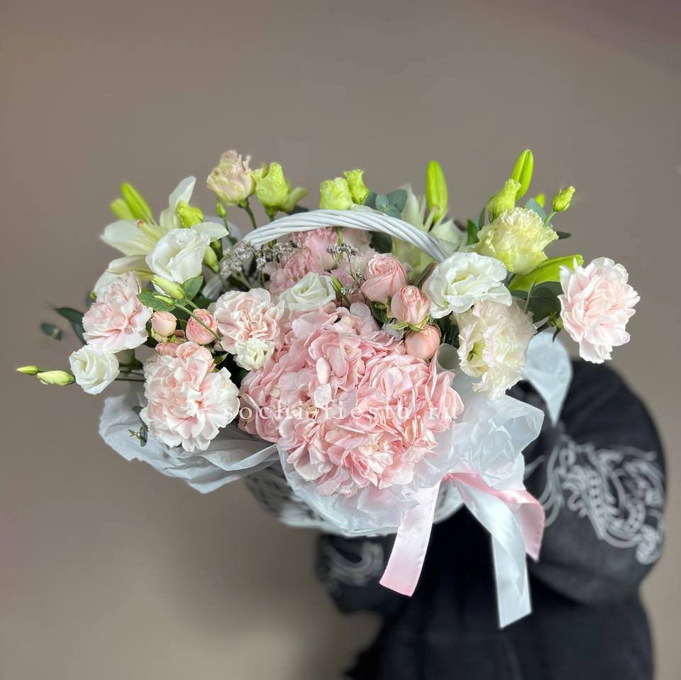 Плотная россыпь кустовых роз и эустомы создает живую текстуру с множеством мелких бутонов. Диантус добавляет воздушности, а эвкалипт собирает композицию в завершенную форму. Корзина позволяет разместить букет на столе без дополнительной вазы.
