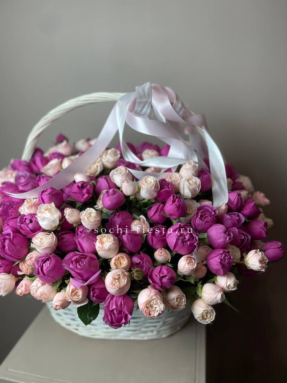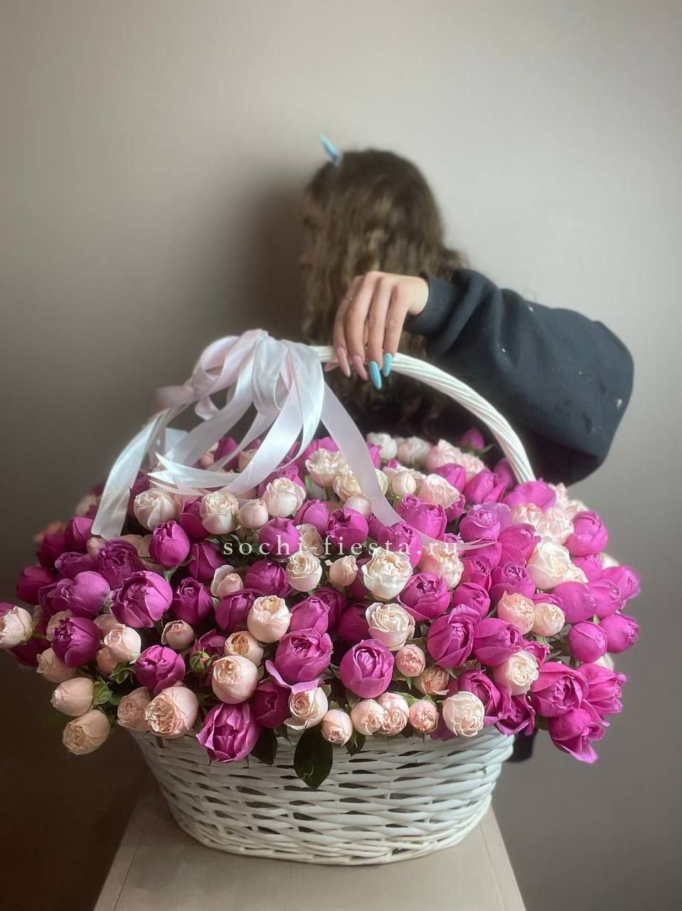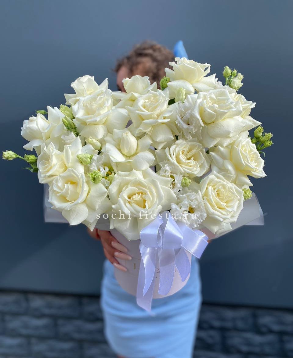 Монументальная композиция из полутора сотен белоснежных бутонов создает впечатление цветочного облака. Корзина придает устойчивость и завершенность форме, позволяя разместить такой масштабный ансамбль в любом пространстве.