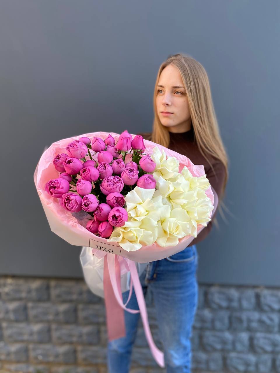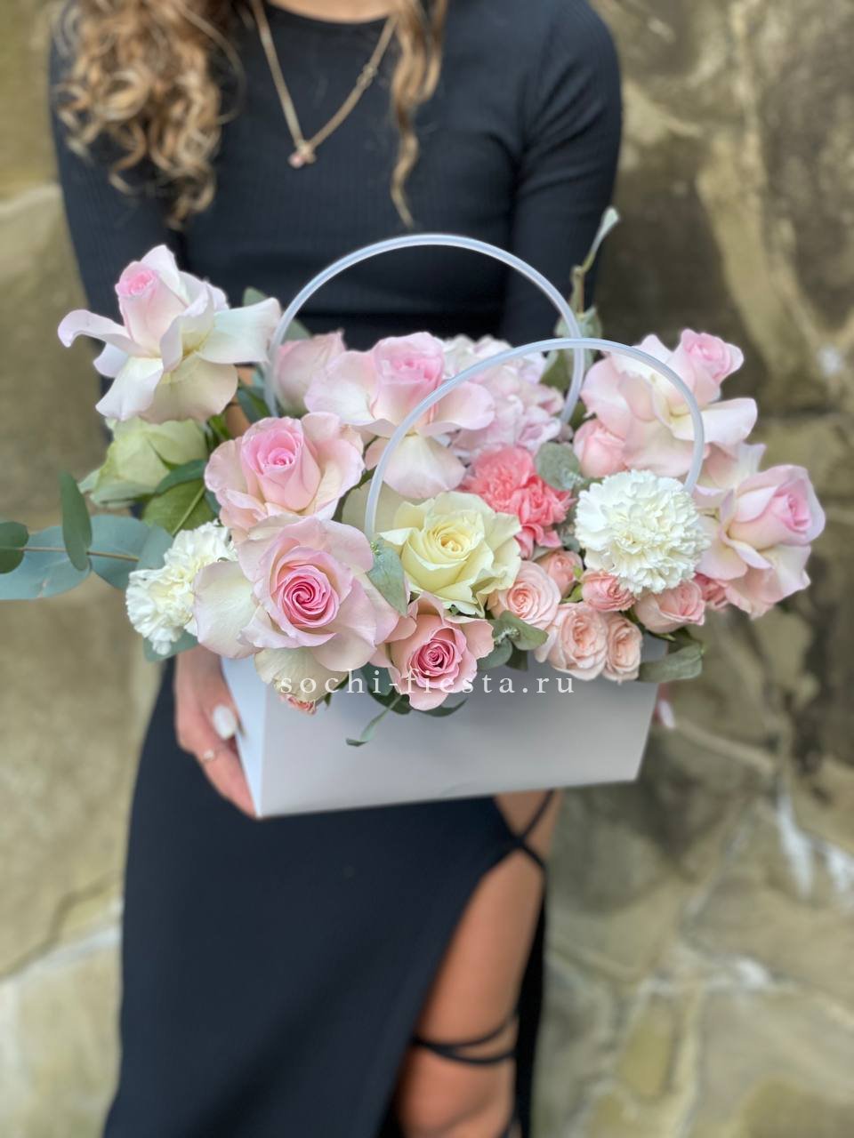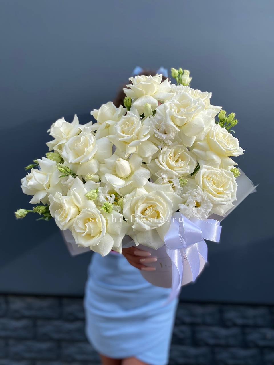 Монументальная композиция из полутора сотен белоснежных бутонов создает впечатление цветочного облака. Корзина придает устойчивость и завершенность форме, позволяя разместить такой масштабный ансамбль в любом пространстве.