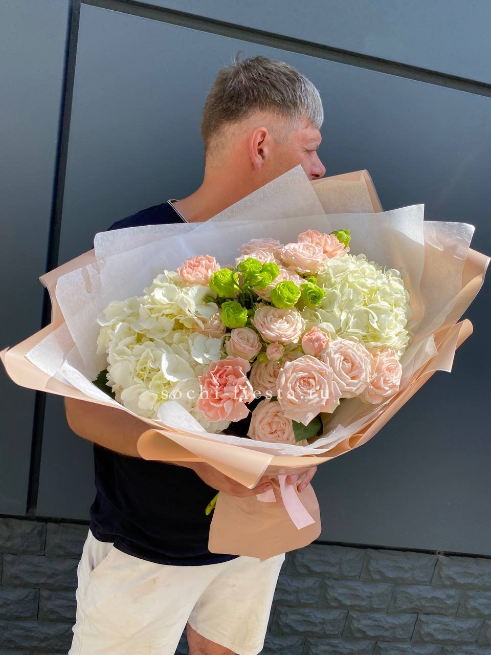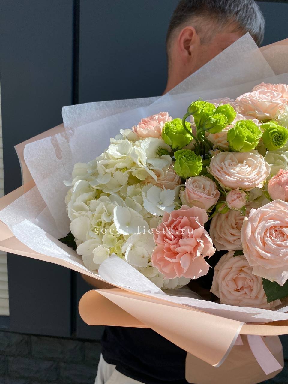 Французская надпись и место для личных слов. Плотная бумага держит форму и дополняет букет романтичным акцентом. Текст размещается на развороте аккуратным шрифтом.