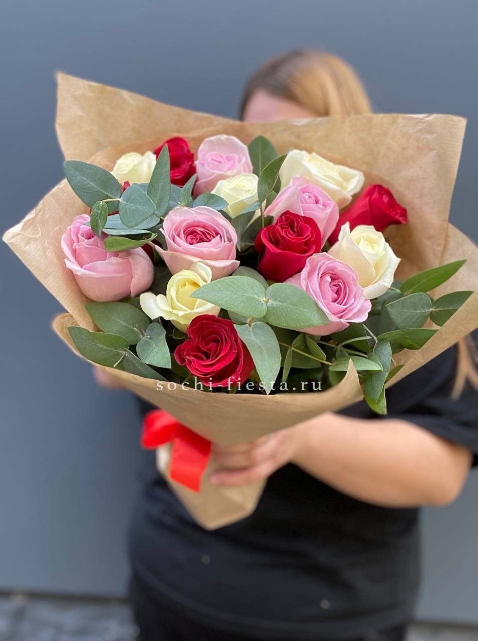 Букет из 15 роз с эвкалиптом