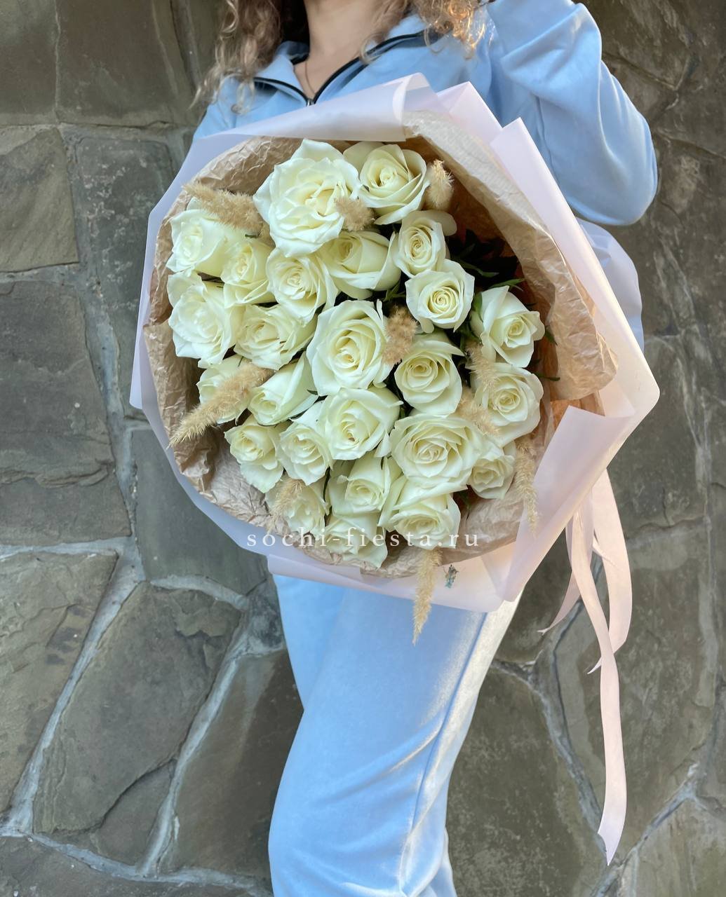 Белоснежные головки роз соседствуют с воздушными сухоцветами, создавая игру объёмов. Двадцать пять стеблей формируют насыщенную композицию с природной лёгкостью. Букет звучит свежо и живо.