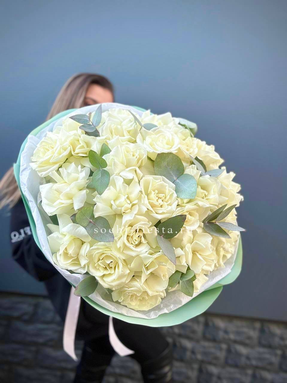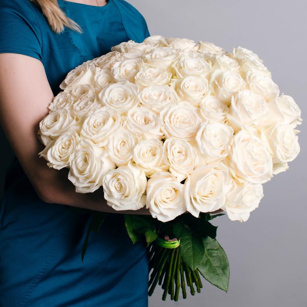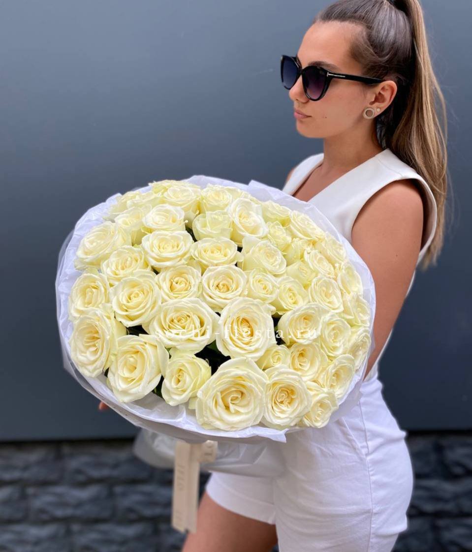 Тридцать пять белых бутонов образуют плотный монохромный ансамбль. Классическая форма и чистота оттенка позволяют букету звучать самодостаточно в любом интерьере.