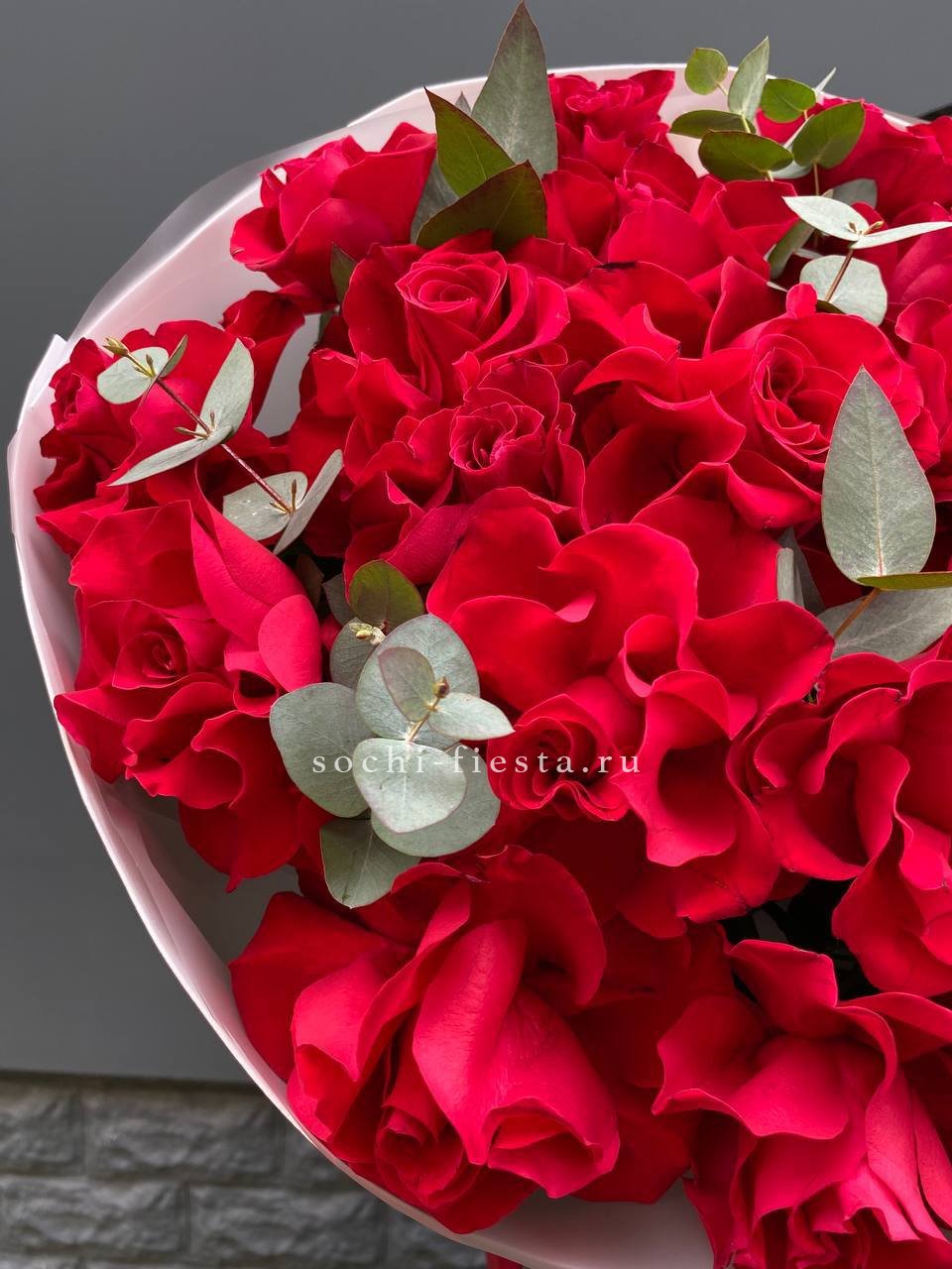 Двадцать три бутона выстроены в плотную округлую форму с чёткими линиями и выразительным силуэтом. Французские розы держат форму уверенно, а свежая зелень добавляет композиции графичности и завершённости.