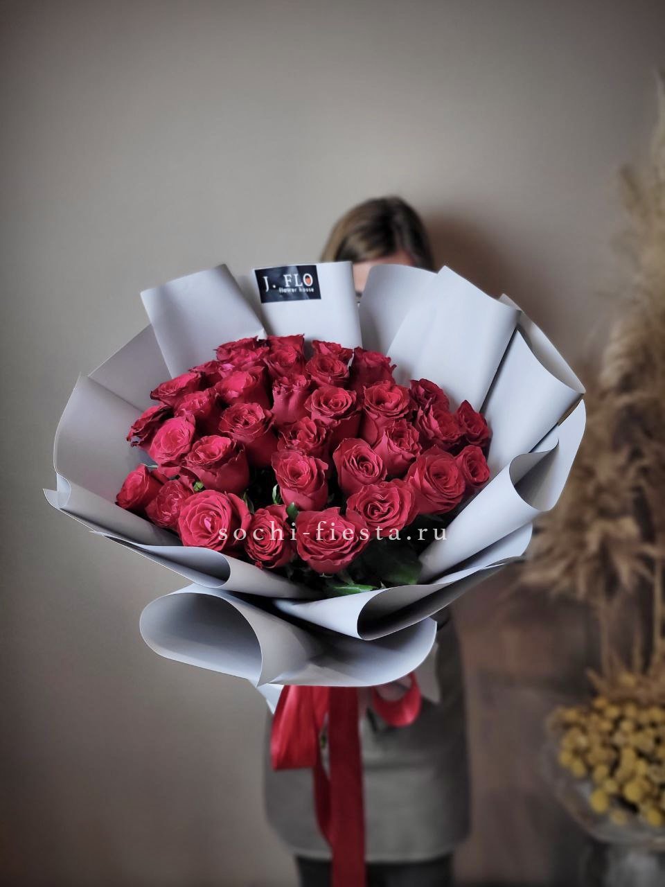 33 красных роз, лента, дизайнерская упаковка
