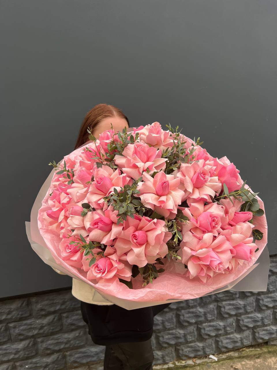 Розовые бутоны собраны в свободную форму с мягкими переходами по высоте. Лепестки играют оттенками от пудры до персика и создают живую подвижную текстуру.