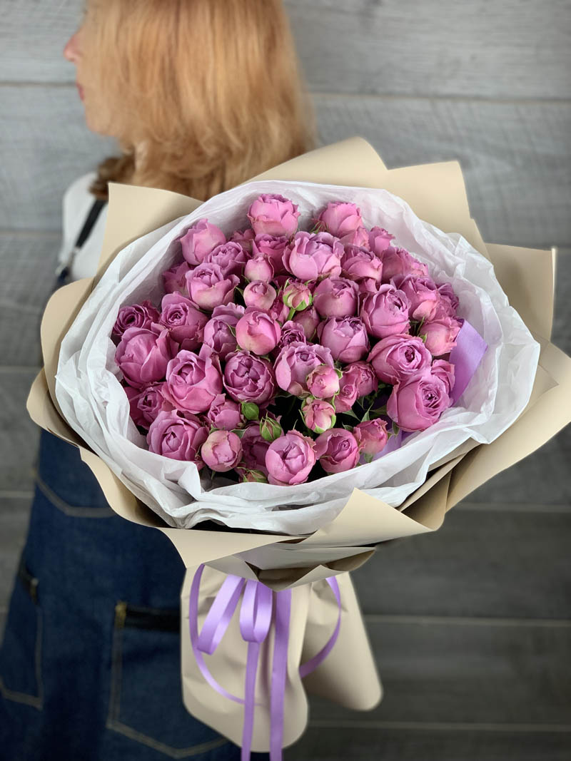 55 роз сорта Misty bubbles и bombastic, лента, дизайнерская упаковка.