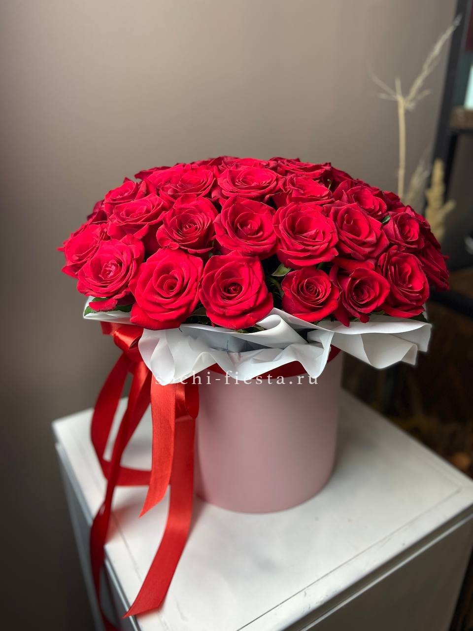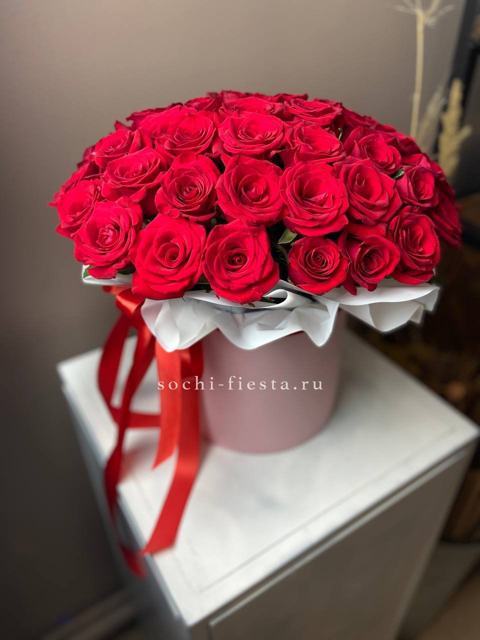 Пятьдесят пять роз двух сортов образуют монументальную композицию с выраженным присутствием в пространстве. Крупные бутоны создают плотную текстуру и заполняют объём без пустот. Впечатление масштаба и продуманной гармонии.