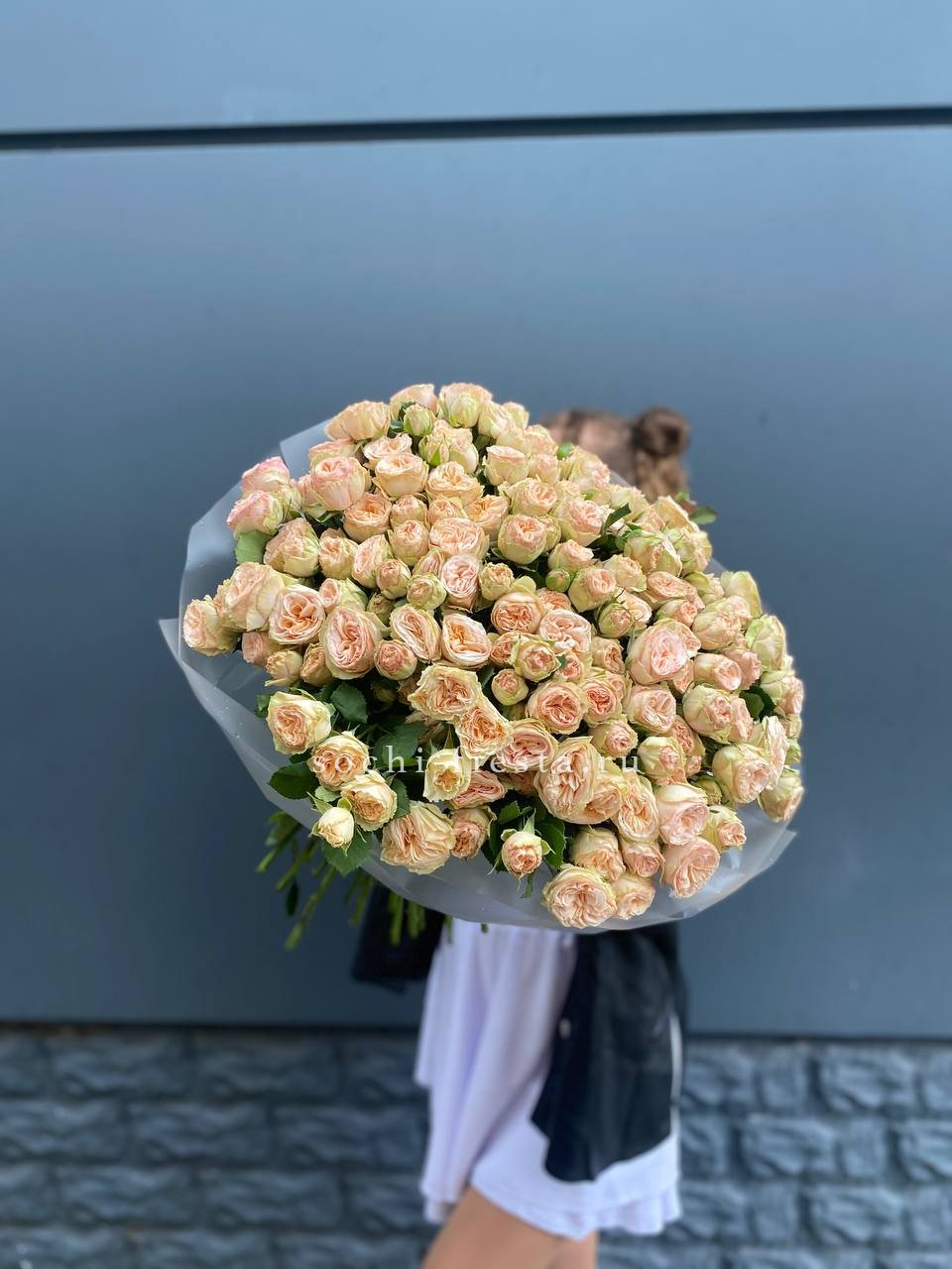 Пятьдесят один бутон образует масштабную композицию, которая притягивает внимание и заполняет пространство. Пионовидные розы создают впечатление цветочного облака с мягкими переливами оттенков.