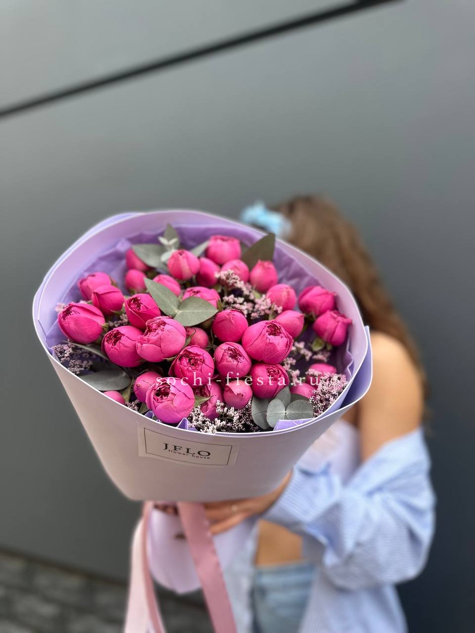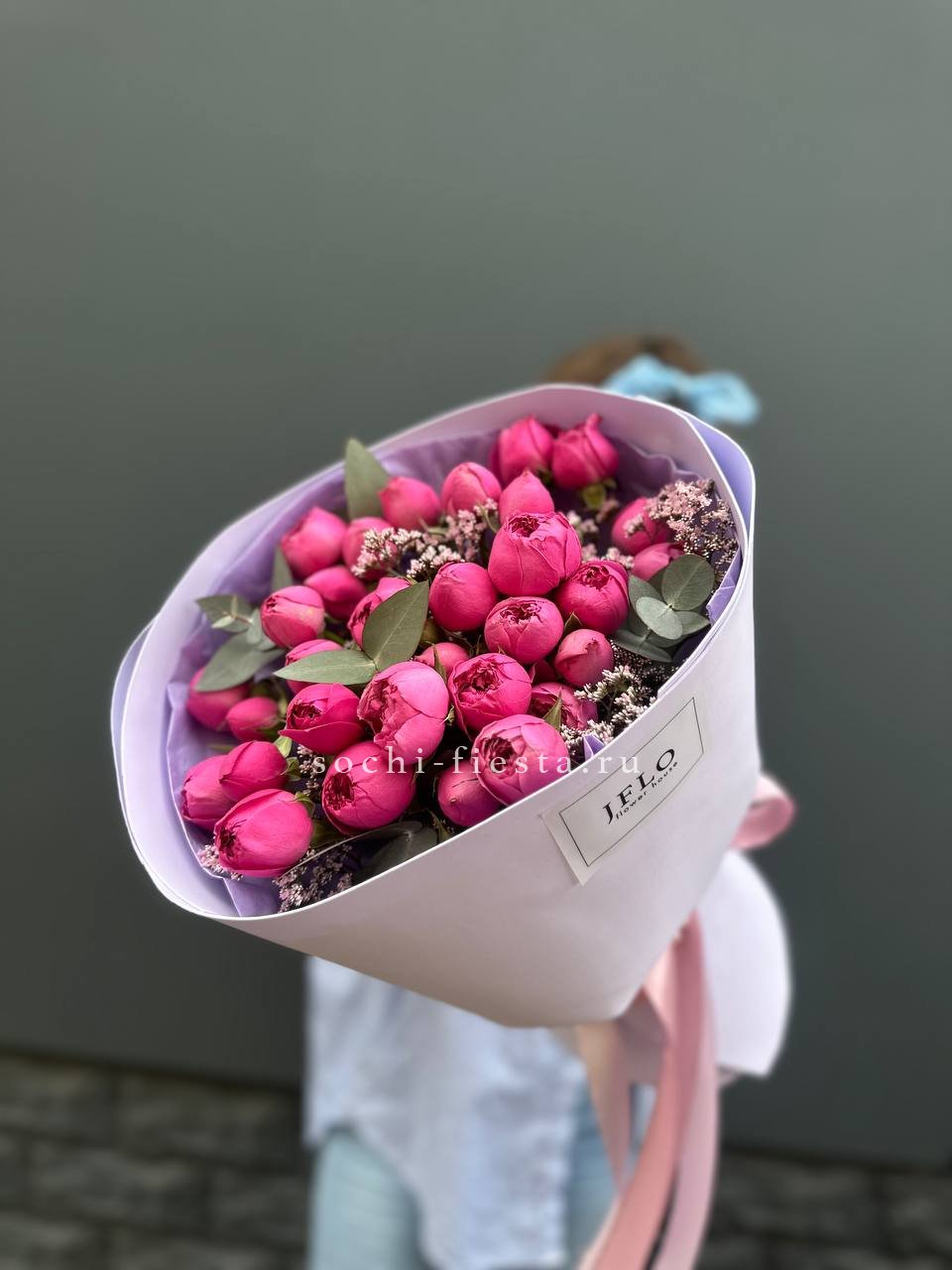 Пятнадцать веток с многослойными бутонами в лилово-розовой гамме собраны в свободную форму. Выбор упаковки остаётся за вами: крафт или лента подчеркнут естественную красоту цветов. Букет сохраняет свежесть и форму долгое время.