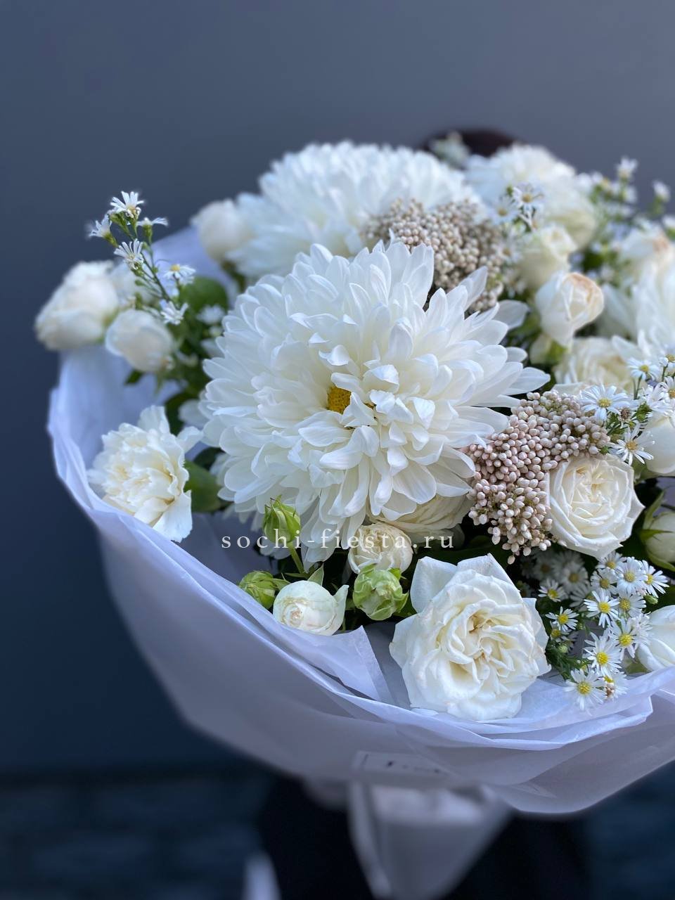 Белые хризантемы и кустовые розы собраны в плотную сферу, которая читается цельным светлым пятном. Матрикария и озотамнус заполняют пространство между бутонами, создавая ощущение снежного облака.