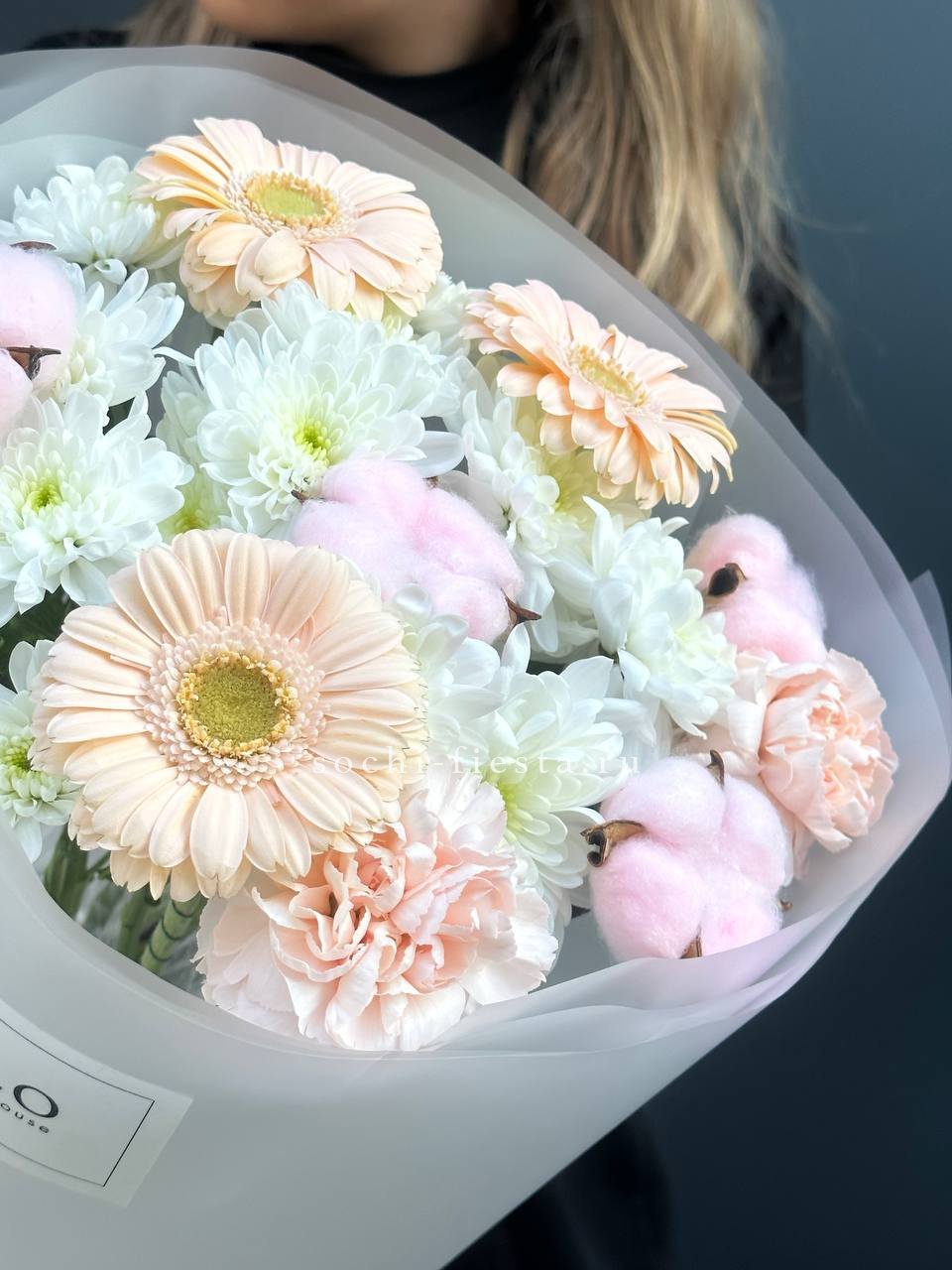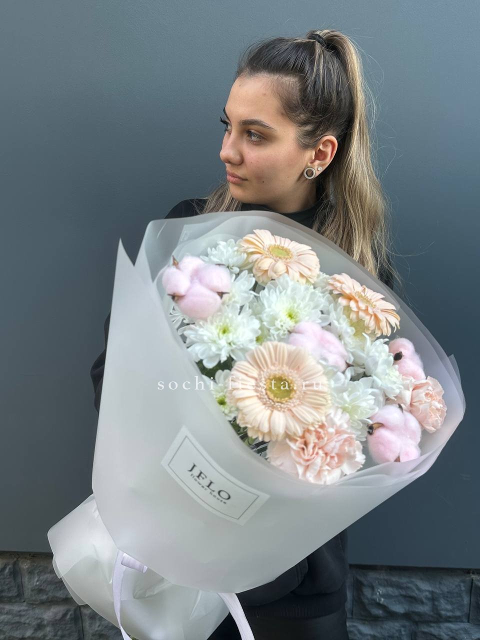 протея, декоративная зелень в зависимости от сезона, антиринум, дизайнерская упаковка.