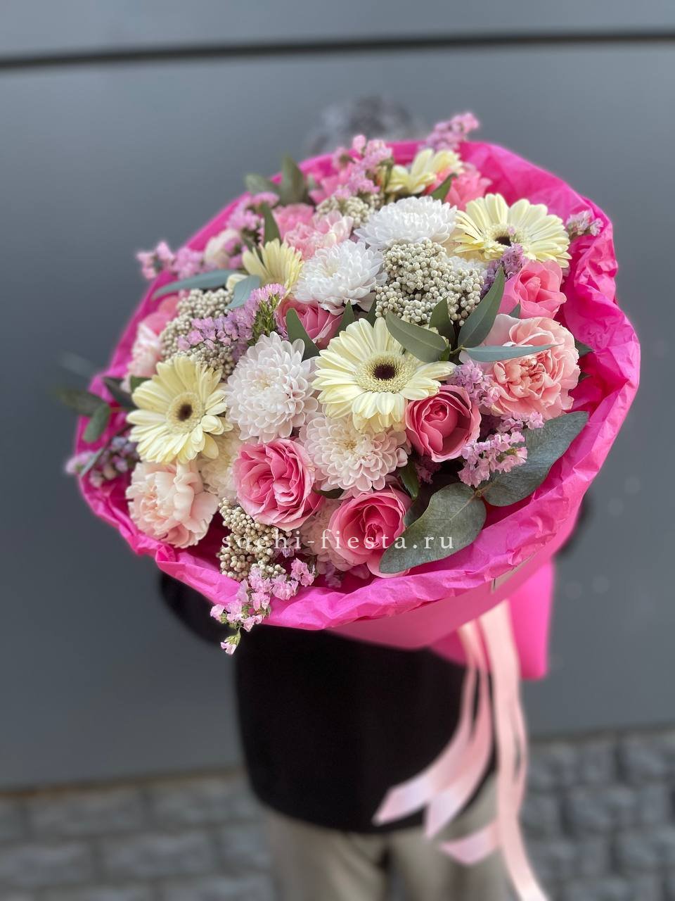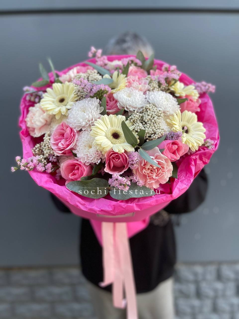 Гортензия образует пышную основу, сквозь которую проступают светлые головки эустомы и роз. Бомбастик вносит графичность, создавая объём и глубину.