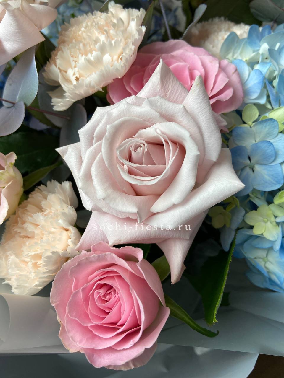 Пышная гортензия задает тон всей композиции, а розы и диантусы добавляют глубину и насыщенность. Синие штрихи дельфиниума создают живой ритм между соцветиями.