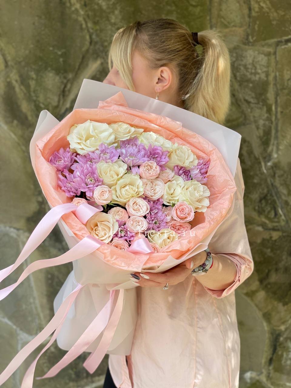 Экзотическая протея сочетается с пионовидными розами Элеонора и диантусами. Букет напоминает прогулку по ботаническому саду, где встречаются разные климатические зоны.