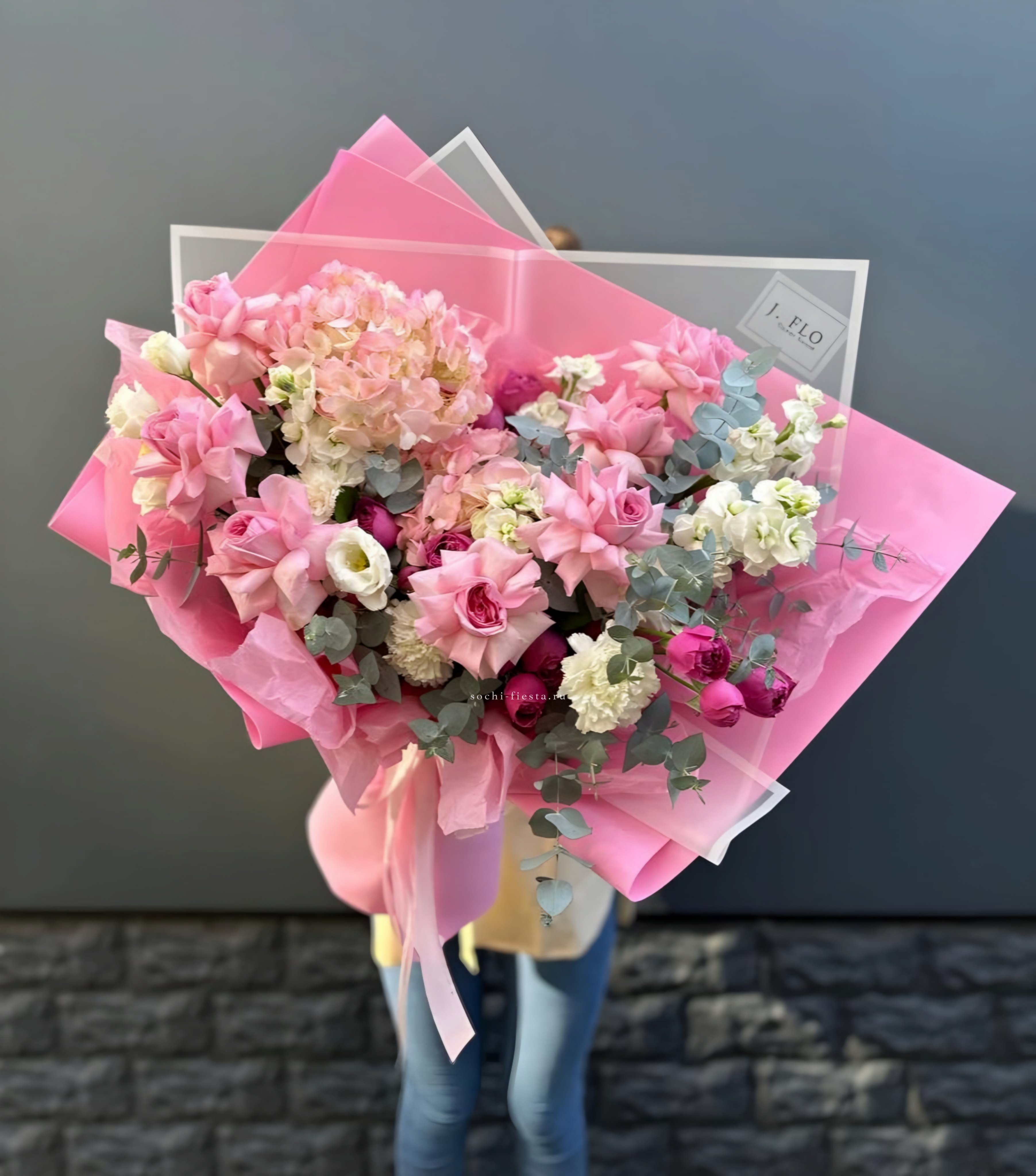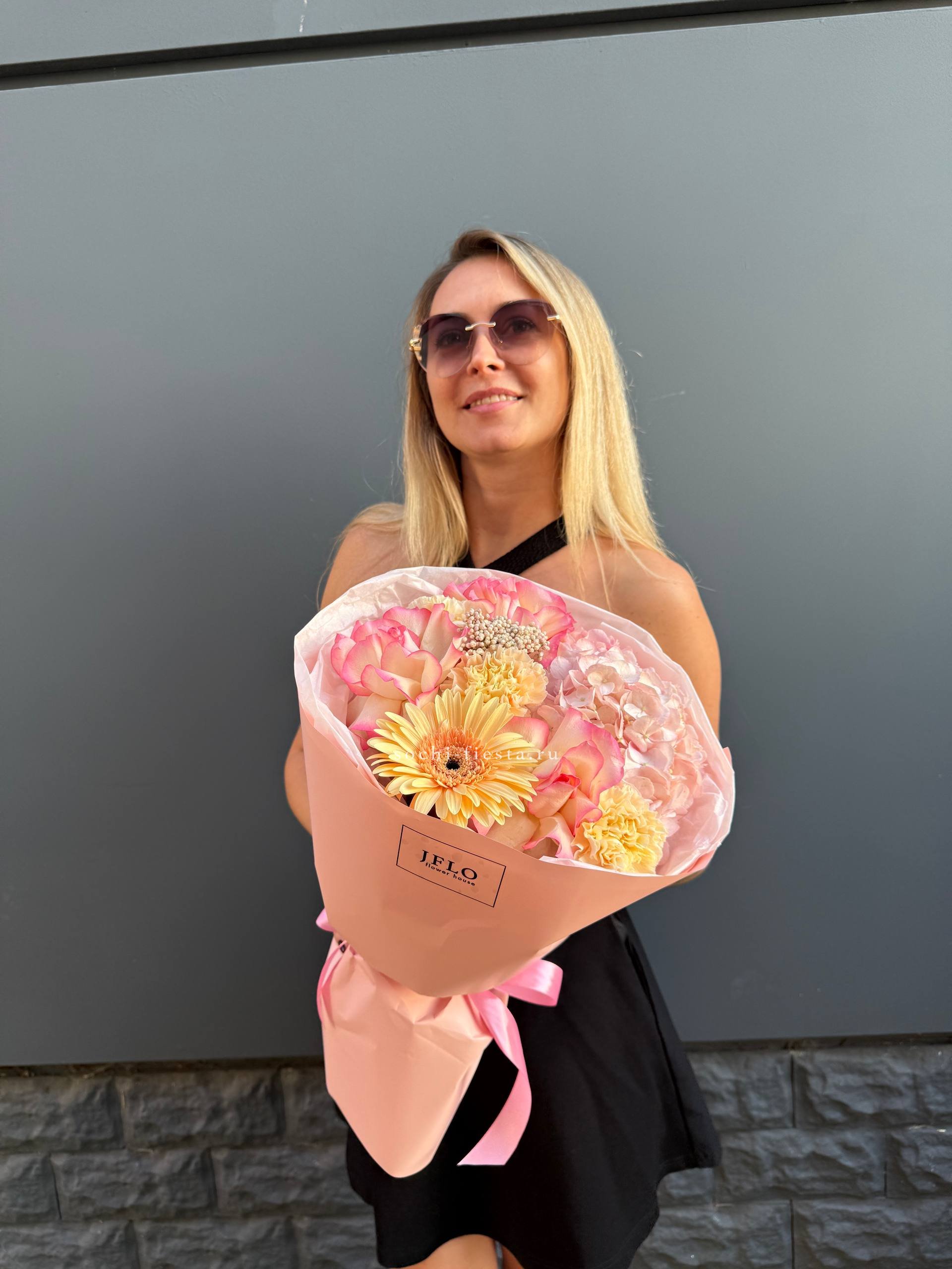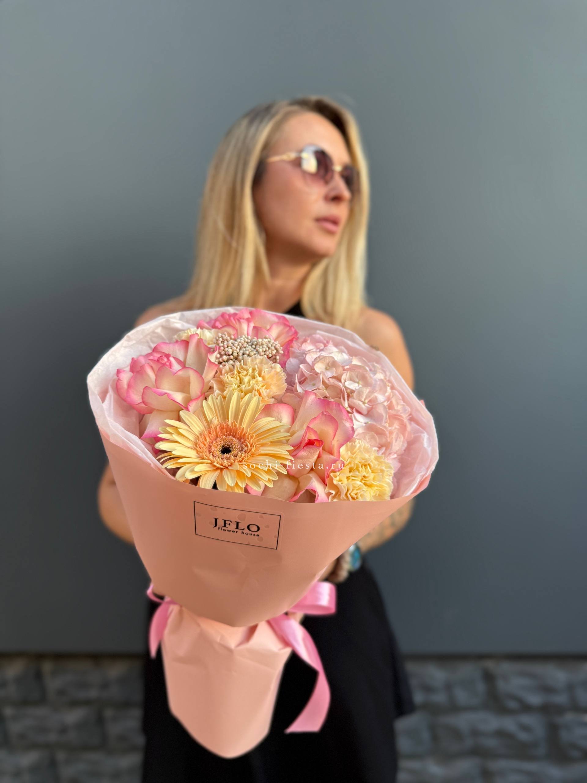 Герберы и гортензия создают воздушную композицию с лёгким ритмом и плавными переходами. Бомбамстик добавляет графики, а диантус смягчает общую форму.