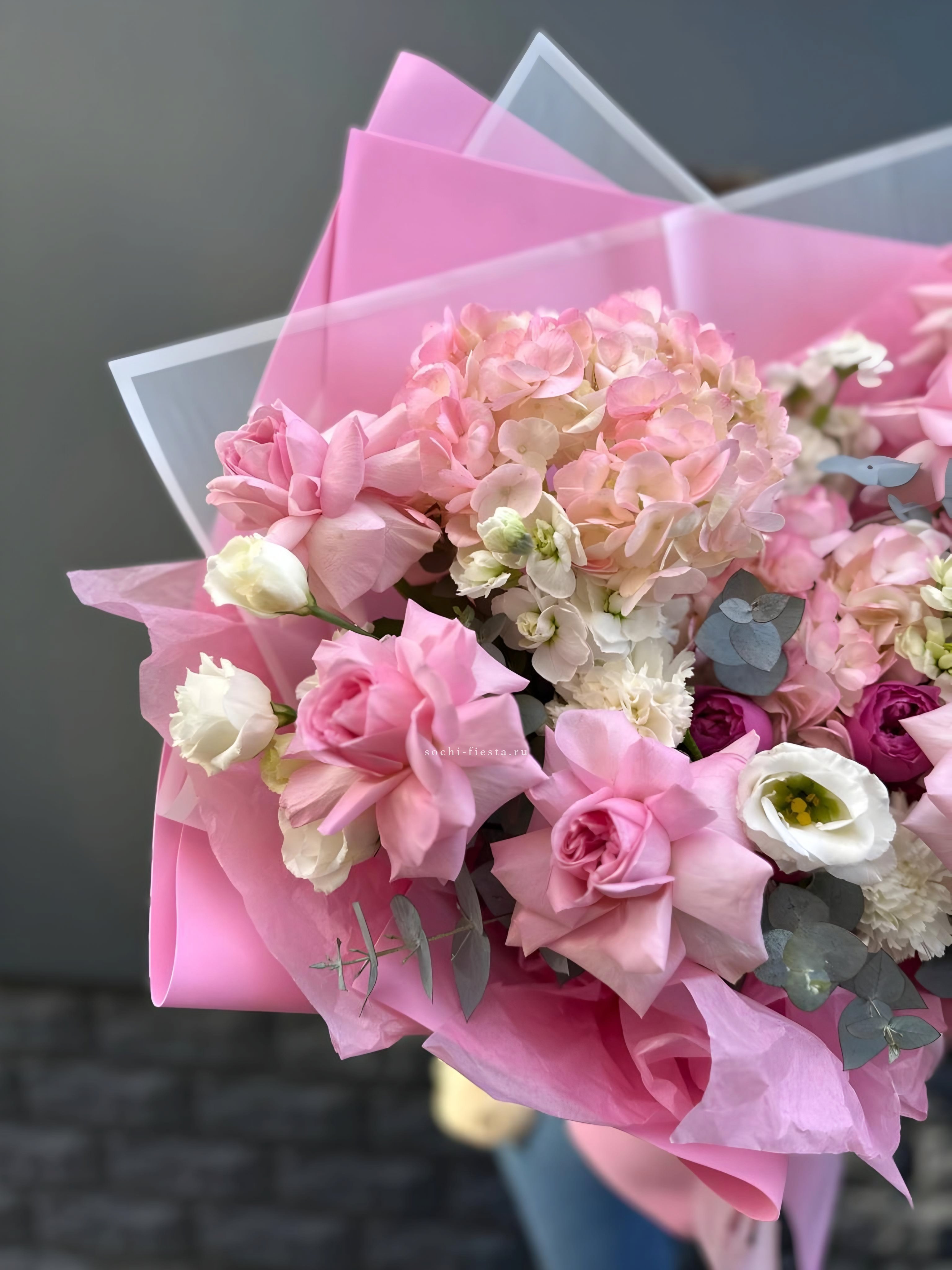 гербера, диантус, гортензия, бомбамстик, озатамус в нежном оформлении.